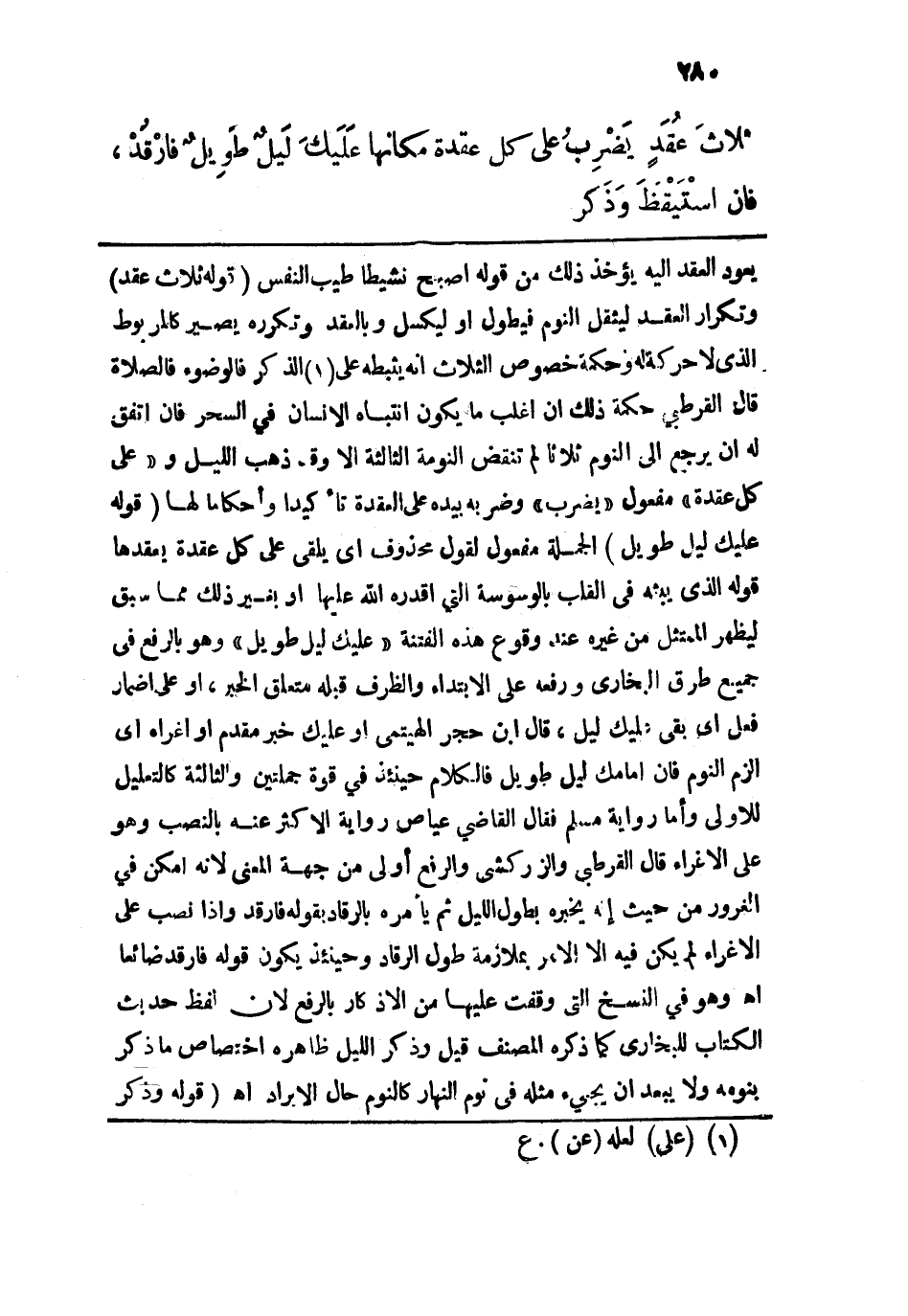 يعود العقد إليه يؤخذ ذلك من قوله أصبح نشيطاً طيب النفس. قوله: (ثلاث عقَدٍ) وتكرار العقد ليثقل النوم فيطول أو ليكسل وبالعقد وتكرره يصير كالمربوط الذي لا حركة له وحكمة خصوص الثلاث إنه يثبطه على الذكر فالوضوء فالصلاة قال القرطبي حكمة ذلك إن أغلب ما يكون انتباه الإنسان في السحر فإن اتفق له إن يرجع إلى النوم ثلاثاً لم تنقض النومة الثالثة إلاَّ وقد ذهب الليل و"على كل عقدة" مفعول "يضرب" وضربه بيده على العقدة تأكيداً وأحكاماً لها. قوله: (عَلَيكَ لَيلٌ طَوِيلٌ) الجملة مفعول لقول محذوف أي يلقي على كل عقدة يعقدها قوله الذي يبثه في القلب بالوسوسة التي أقدره الله عليها أو بغير ذلك مما سبق ليظهر المتمثل من غيره عند وقوع هذه الفتنة "عليك ليل طويل" وهو بالرفع في جميع طرق البخاري ورفعه على الابتداء والظرف قبله متعلق الخبر، أو على إضمار فعل أي بقي عليك ليل، قال ابن حجر الهيتمي أو عليك خبر مقدم أو أغراه أي الزم النوم فإن أمامك ليل طويل فالكلام حينئذٍ في قوة جملتين والثالثة كالتعليل للأولى وأما رواية مسلم فقال القاضي عياض رواية الأكثر عنه بالنصب وهو على الإغراء قال القرطبي والزركشي والرفع أولى من جهة المعنى لأنه أمكن في الغرور من حيث إنه يخبره بطول الليل ثم يأمره بالرقاد بقوله فارقد وإذا نصب على الإغراء لم يكن فيه إلاَّ الأمر بملازمة طول الرقاد وحينئذٍ يكون قوله فارقد ضائعاً اهـ، وهو في النسخ التي وقفت عليها من الأذكار بالرفع لأن لفظ حديث الكتاب للبخاري كما ذكره المصنف قيل