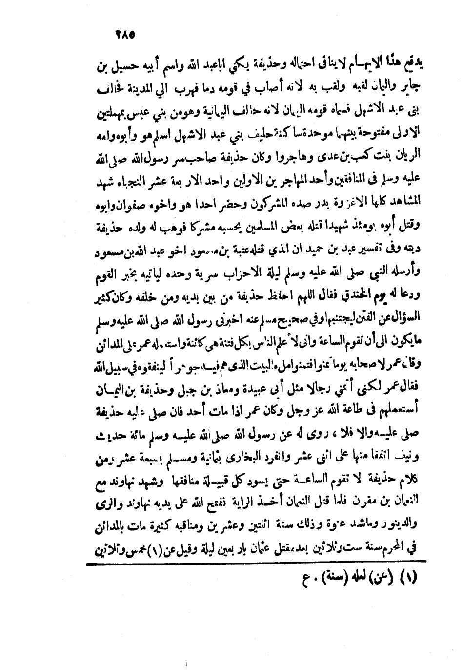 يدفع هذا الإيهام لا ينافي احتماله وحذيفة يكنى أبا عبد الله واسم أبيه حسيل بن جابر واليمان لقبه ولقب به لأنه أصاب في قومه دما فهرب إلى المدينة فحالف بني عبد الأشهل فسماه قومه اليمان لأنه حالف اليمانية وهو من بني عبس بمهملتين الأولى مفتوحة بينهما موحدة ساكنة حليف بني عبد الأشهل أسلم هو وأبوه وأمه الريان بنت كعب بن عدي وهاجروا وكان حذيفة صاحب سر رسول الله - صلى الله عليه وسلم - في المنافقين وأحد المهاجرين الأولين وأحد الأربعة عشر النجباء شهد المشاهد كلها إلاّ غزوة بدر صده المشركون وحضر أحداً هو وأخوه صفوان وأبوه وقتل أبوه يومئذٍ شهيدًا قتله بعض المسلمين يحسبه مشركاً فوهب له ولده حذيفة ديته وفي تفسير عبد بن حميد إن الذي قتله عتبة بن مسعود أخو عبد الله بن مسعود وأرسله النبي - صلى الله عليه وسلم - ليلة الأحزاب سرية وحده ليأتيه بخبر القوم ودعا له يوم الخندق فقال اللهم احفظ حذيفة من بين يديه ومن خلفه وكان كثير السؤال عن الفتن ليجتنبها وفي صحيح مسلم عنه أخبرني رسول الله - صلى الله عليه وسلم - ما يكون إلى أن تقوم الساعة واني لأعلم الناس بكل فتنة هي كائنة واستعمله عمر على المدائن وقال عمر لأصحابه يوماً تمنوا فتمنوا ملء البيت الذي هم فيه جوهراً لينفقوه في سبيل الله فقال عمر لكني أتمنى رجالاً مثل أبي عبيدة ومعاذ بن جبل وحذيفة بن اليمان استعملهم في طاعة الله عز وجل وكان عمر إذا مات أحد فإن صلى عليه حذيفة صلى عليه وإلاّ فلا، روي له عن رسول الله - صلى الله عليه وسلم - مائة حديث ونيف اتفقا منها على اثني عشر وانفرد البخاري بثمانية ومسلم بسبعة عشر ومن كلام حذيفة لا تقوم الساعة حتى يسود كل قبيلة منافقها وشهد نهاوند مع النعمان بن مقرن فلما قتل النعمان أخذ الراية ففتح الله على يديه نهاوند والري والدينور وما شد عنوة وذلك سنة اثنتين وعشرين ومناقبه كثيرة مات بالمدائن في المحرم سنة ست وثلاثين بعد مقتل عثمان بأربعين ليلة وقيل عن خمس وثلاثين.