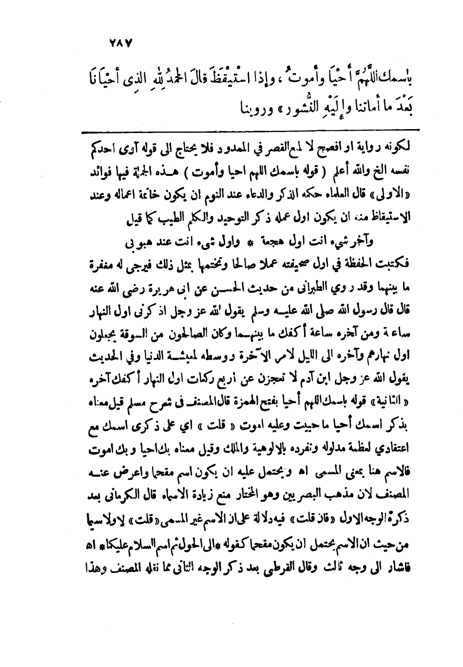 فكتبت الحفظة في أول صحيفته عملاً وتختمها بمثل ذلك فيرجى له مغفرة ما بينهما وقد روى الطبراني من حديث الحسن عن أبي هريرة رضي الله عنه قال قال رسول الله - صلى الله عليه وسلم - يقول الله عز وجل اذكرني أول النهار ساعة ومن آخره ساعة أكفك ما بينهما وكان الصالحون من السوقة يجعلون أول نهارهم وآخره إلى الليل لأمر الآخرة ووسطه لمعيشة الدنيا وفي الحديث يقول الله عز وجل ابن آدم لا تعجزن عن أربع ركعات أول النهار أكفك آخره "الثانية" قوله باسمك اللهم أحيا بفتح الهمزة قال المصنف في شرح مسلم قيل معناه بذكر اسمك أحيا ما حييت وعليه أموت "قلت" أي على ذكري اسمك مع اعتقادي لعظمة مدلوله وتفرده بالألوهية والملك وقيل معناه بك أحيا وبك أموت فالاسم هنا بمعنى المسمى اهـ، ويحتمل عليه إن يكون اسم مقحماً وأعرض عنه المصنف لأن مذهب البصريين وهو المختار منع زيادة الأسماء قال الكرماني بعد ذكره الوجه الأول "فإن قلت" فيه دلالة على إن الاسم غير المسمى "قلت" لا ولا سيما من حيث إن الاسم يحتمل أن يكون مقحماً كقوله: