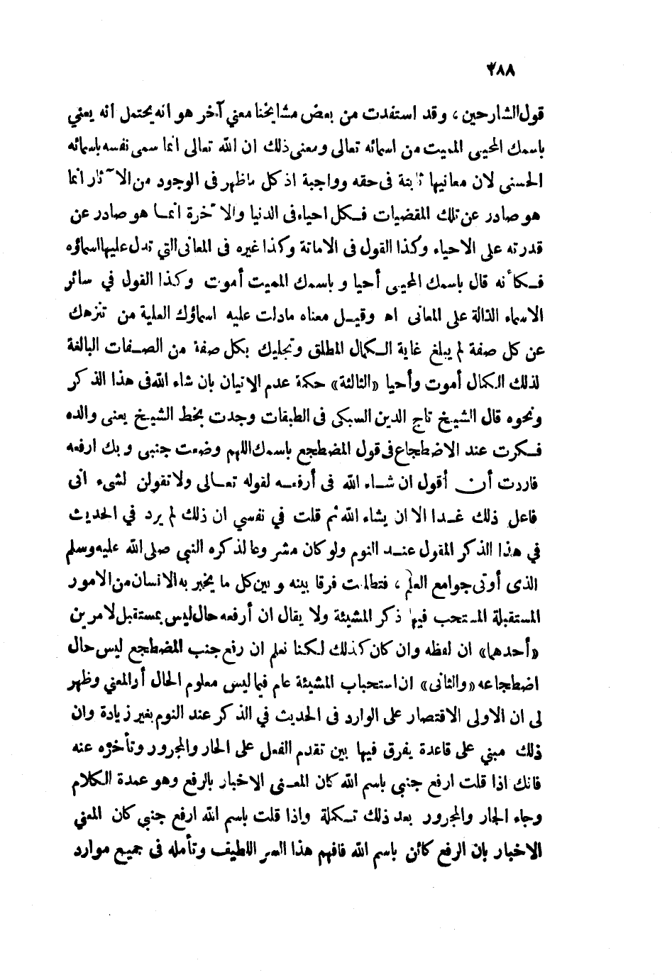 قول الشارحين، وقد استفدت من بعض مشايخنا معنى آخر هو أنه يحتمل أنه يعني باسمك المحيي المميت من أسمائه تعالى ومعنى ذلك إن الله تعالى إنما سمى نفسه بأسمائه الحسنى لأن معانيها ثابتة في حقه وواجبة إذ كل ما ظهر في الوجود من الآثار إنما هو صادر عن تلك المقضيات فكل إحياء في