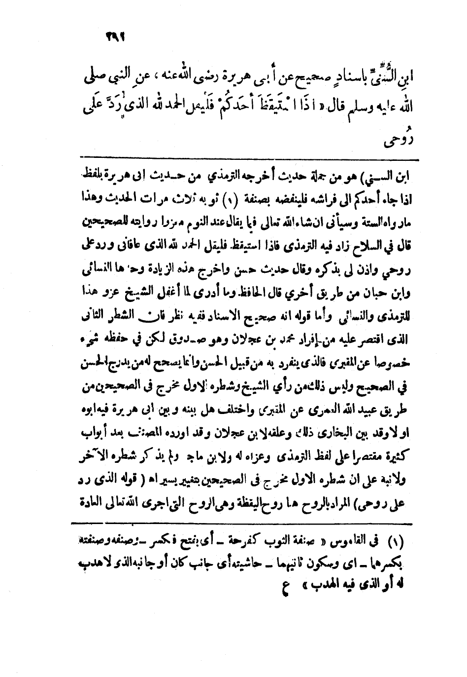 ابن السني بإسناد صحيح عن أبي هريرة رضي الله عنه عن النبي - صلى الله عليه وسلم - قال: "إذَا اسْتَيقَظَ أحدُكُمْ فَلْيَقُلْ: الحَمْدُ لِلهِ الّذِي رَدَّ عَليَّ رُوحِي،