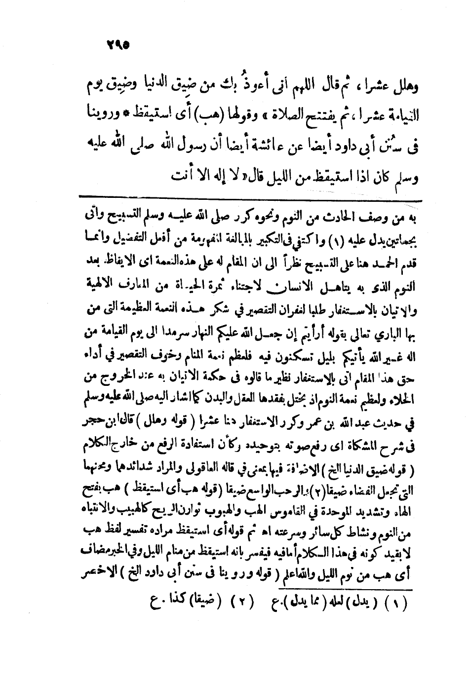 به من وصف الحادث من النوم ونحوه كرر - صلى الله عليه وسلم - التسبيح وأتى بجملتين يدل عليه واكتفى في التكبير بالمبالغة المفهومة من أفعل التفضيل وإنما قدم الحمد هنا على التسبيح نظرًا إلى إن المقام له على هذه النعمة أي الإيقاظ بعد النوم الذي به يتأهل الإنسان لاجتناء ثمرة الحياة من المعارف الإلهية والإتيان بالاستغفار طلباً لغفران التقصير في شكر هذه النعمة العظيمة التي من بها الباري تعالى بقوله: {قُلْ أَرَأَيْتُمْ إِنْ جَعَلَ اللَّهُ عَلَيْكُمُ النَّهَارَ سَرْمَدًا إِلَى يَوْمِ الْقِيَامَةِ مَنْ إِلَهٌ غَيْرُ اللَّهِ يَأْتِيكُمْ بِلَيْلٍ تَسْكُنُونَ فِيهِ} [القصص: 72] فلعظم نعمة المنام وخوف التقصير في أداء حق هذا المقام أتى بالاستغفار نظير ما قالوه في حكمة الإتيان به عند الخروج من الخلاء ولعظيم نعمة النوم إذ يختل بفقدها العقل والبدن كما أشار إليه - صلى الله عليه وسلم - في حديث عبد الله بن عمر وكرر الاستغفار هنا عشراً. قوله: (وهلل) قال ابن حجر في شرح المشكاة أي رفع صوته بتوحيده وكأن استفادة الرفع من خارج الكلام. قوله: (ضِيق الدنيا إلخ) الإضافة فيها بمعنى في قاله