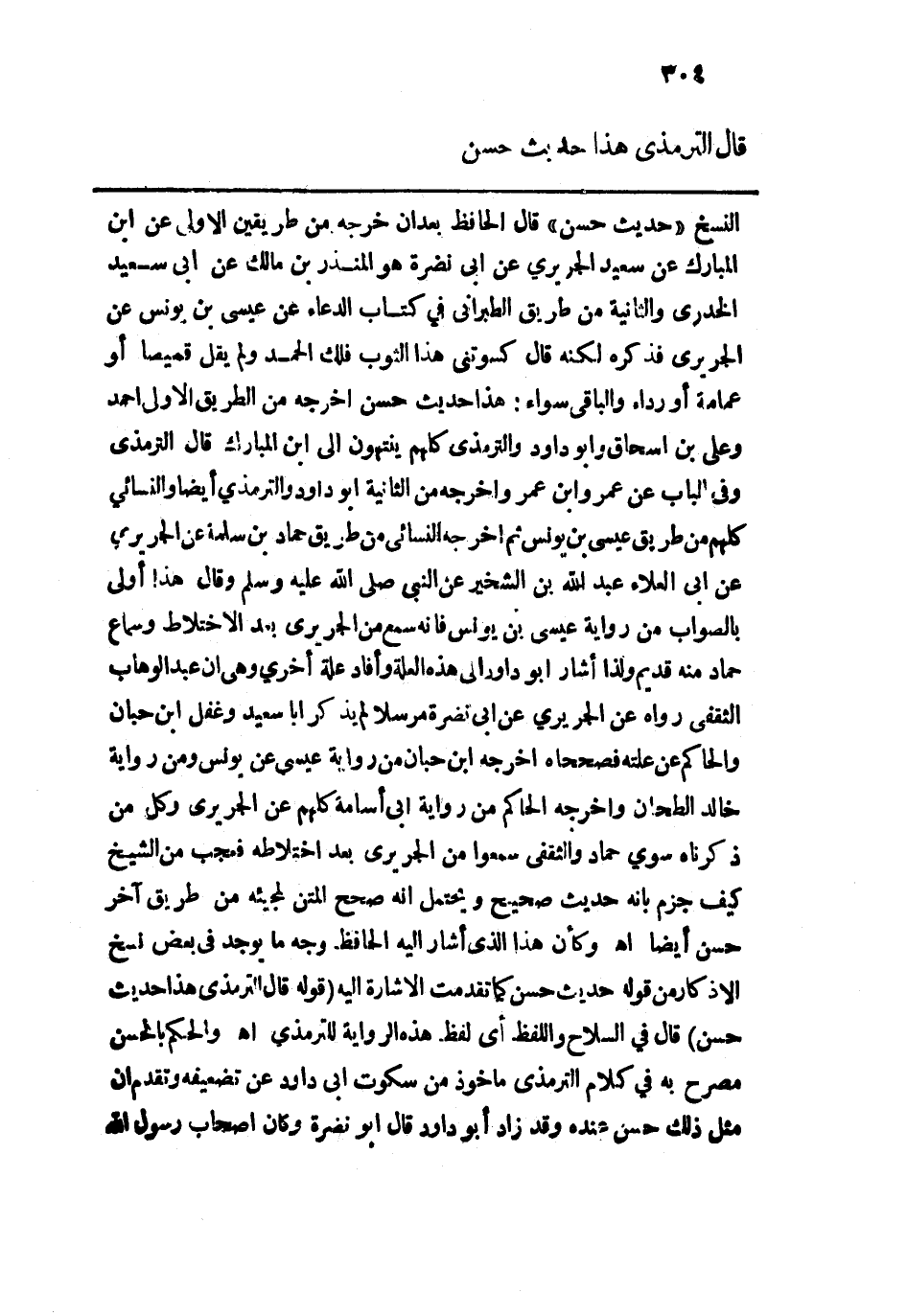 فعجب من الشيخ كيف جزم بأنه حديث صحيح ويحتمل أنه صحح المتن لمجيئه من طريق آخر حسن أيضاً اهـ، وكأن هذا الذي أشار إليه الحافظ وجه ما يوجد في بعض نسخ الأذكار من قوله حديث حسن كما تقدمت الإشارة إليه. قوله: (قال الترمذي هذا حديث حسن) قال في السلاح واللفظ أي لفظ هذه الرواية للترمذي اهـ، والحكم بالحسن مصرح به في كلام الترمذي مأخوذ من سكوت أبي داود عن تضعيفه وتقدم إن مثل ذلك حسن عنده وقد زاد أبو داود قال أبو نضرة وكان أصحاب رسول الله