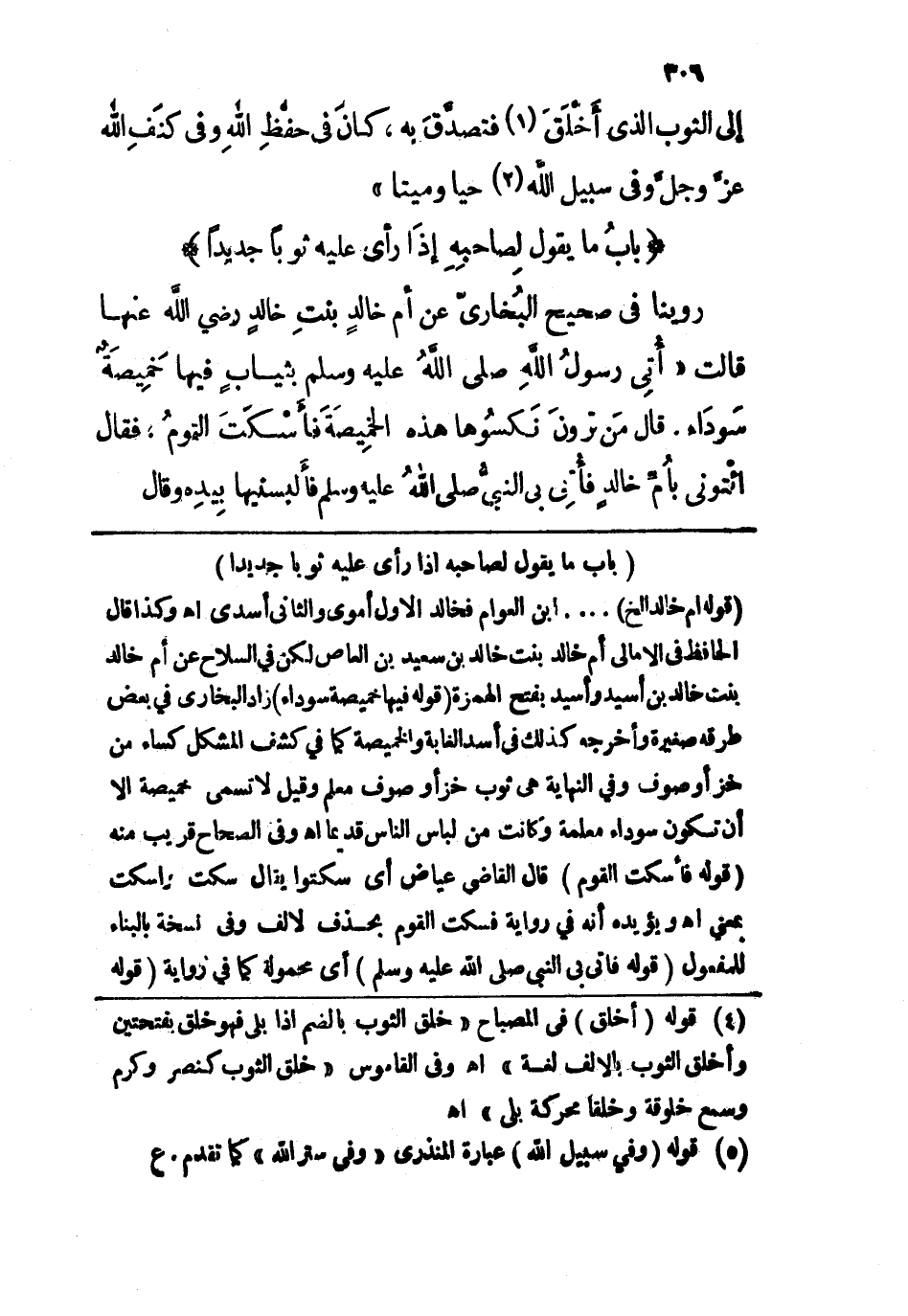 قوله: (أم خالدٍ) .. ابن العوام فخالد الأول أموي والثاني أسدي اهـ، وكذا قال الحافظ في الأمالي أم خالد بنت خالد بن سعيد بن العاص لكن في السلاح عن أم خالد بنت خالد بن أسيد وأسيد بفتح الهمزة. قوله: (فيها خَمِيصَة سَودَاء) زاد البخاري في بعض طرقه صغيرة وأخرجه كذلك في أسد الغابة والخميصة كما في كشف المشكل كساء من خز أو صوف وفي النهاية هي ثوب خز أو صوف معلم وقيل لا تسمى خميصة إلاَّ أن تكون سوداء معلمة وكانت من لباس الناس قديماً اهـ، وفي الصحاح قريب منه. قوله: (فَأسْكَتَ القومُ) قال القاضي عياض أي سكتوا يقال سكت وأسكت بمعنى اهـ ويؤيده أنه في رواية فسكت القوم بحذف الألف وفي نسخة بالبناء للمفعول. قوله: (فأُتِي رسولُ الله - صلى الله عليه وسلم - أي محمولة كما في رواية. قوله: