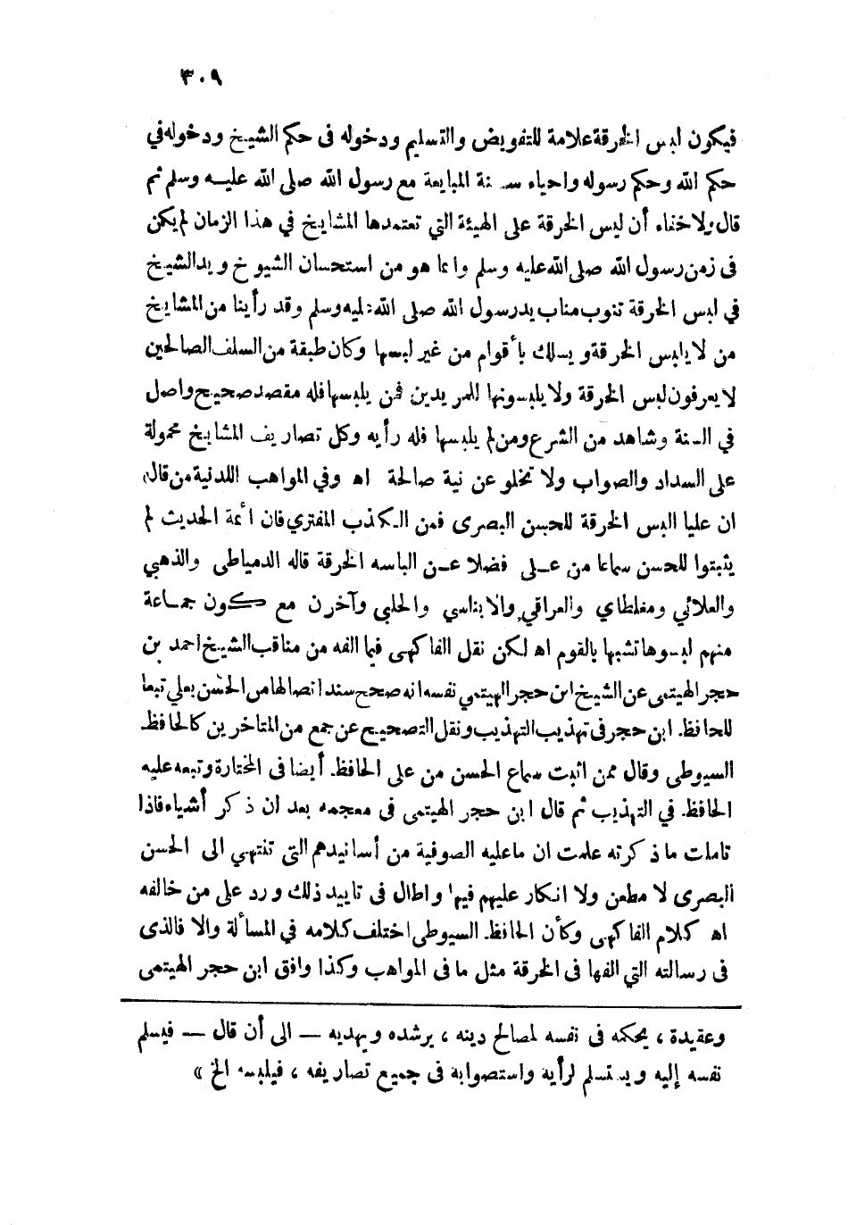 إن علياً البس الخرقة للحسن البصري فمن الكذب المفترى فإن أئمة الحديث لم يثبتوا للحسن سماعاً من علي فضلاً عن إلباسه الخرقة قاله الدمياطي والذهبي والعلائي ومغلطاي والعراقي والابناسي والحلبي وآخرون مع كون جماعة منهم لبسوها تشبهاً بالقوم اهـ، لكن نقل الفاكهي فيما ألفه من مناقب الشيخ أحمد بن حجر الهيتمي عن الشيخ ابن حجر الهيتمي نفسه أنه صحح سند اتصالها من الحسن بعلي تبعاً للحافظ ابن حجر في تهذيب التهذيب ونقل التصحيح عن جمع من المتأخرين كالحافظ السيوطي وقال ممن أثبت سماع الحسن من علي الحافظ أيضاً في المختارة وتبعه عليه الحافظ في التهذيب ثم قال ابن حجر الهيتمي في معجمه بعد أن ذكر أشياء فإذا تأملت ما ذكرته علمت إن ما عليه الصوفية من أسانيدهم التي تنتهي إلى الحسن البصري لا مطعن ولا إنكار عليهم فيها وأطال في تأييد ذلك ورد على من خالفه اهـ، كلام الفاكهي وكأن الحافظ السيوطي اختلف كلامه في المسألة وإلا فالذي في رسالته التي ألفها في الخرقة مثل ما في المواهب وكذا وافق ابن حجر الهيتمي