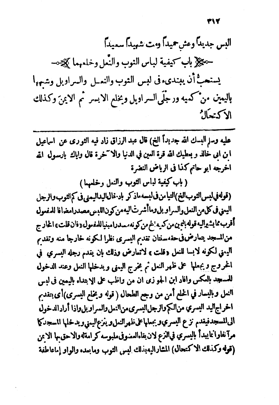 يستحبُّ أن يبتدأ في لبس الثوب والنعل والسراويل وشبهها باليمين من كُمَّيه ورجلي السراويل ويخلع الأيسر، ثم الأيمن، وكذلك الاكتحال،