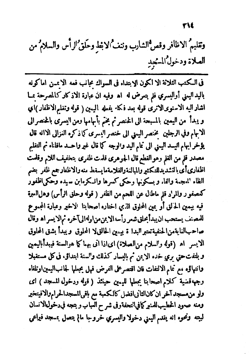 في الكتب الثلاثة إلَّا لكون الابتداء في السواك بجانب فمه الأيمن أما كونه باليد اليمنى أو اليسرى فلم يتمرض له اهـ، وفيه إن عبارة الأذكار كالمصرحة بما أشار إليه الإسنوي ألا ترى قوله بعد فكله يفعله باليمين. قوله: (وتقليمُ الأظافر) أي ويبدأ من اليمين بالمسبحة إلى الخنصر ثم يختم بإبهامها ومن اليسرى بالخنصر إلى الإبهام وفي الرجلين بخنصر اليمنى إلى خنصر اليسرى كما ذكره الغزالي إلاّ أنه قال يؤخر إبهام اليد اليمنى إلى تمام اليد والوجه كما قال غير واحد ما قلناه ثم التقليم مصدر قلم من القلم وهو القطع قال الجوهري قلمت ظفري بتخفيف اللام وقلت أظفاري أي بالتشديد للتكثير والمبالغة والقلامة ما يسقط منه والأظافر جمع ظفر بضم الظاء المعجمة والفاء وبسكونها وحكي كسرها وأنكره ابن سيده وحكي اظفور كعصفور والمراد قلم ما طال عن اللحم من الظفر. قوله: (وحَلقُ الرأس) وهل العبرة فيه بيمين الحالق أو يمين المحلوق الذي اختاره أصحابنا الأخير وعبارة المجموع للمصنف يستحب أن يبدأ بحلق شعر رأسه الأيمن من أوله إلى آخره ثم الأيسر اهـ. وقال صاحب الغاية من الحنفية تعتبر البداة بيمين الحالق لا المحلوق ويبدأ بشق المحلوق الأيسر اهـ. قوله: (والسلامُ من الصلاة) أي إذا أتى بهما كما هو السنة فيبدأ باليمين ويلتفت حتى يرى