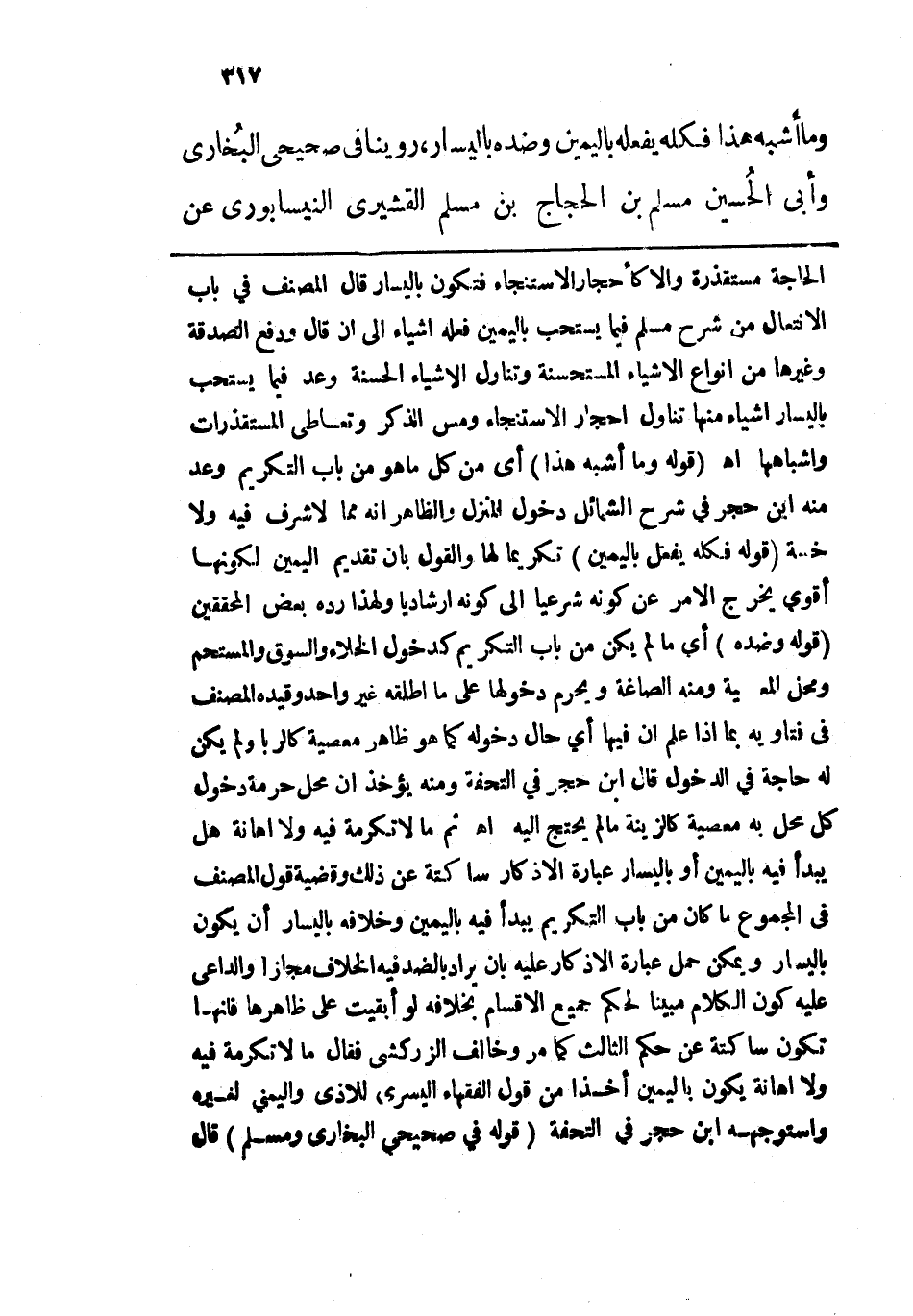 الحاجة مستقذرة وإلا كأحجار الاستنجاء فتكون باليسار قال المصنف في باب الانتعال من شرح مسلم فيما يستحب باليمين فعله أشياء إلى أن قال ودفع الصدقة وغيرها من أنواع الأشياء المستحسنة وتناول الأشياء الحسنة وعد فيما يستحب باليسار أشياء منها تناول أحجار الاستنجاء ومس الذكر وتعاطي المستقذرات وأشباهها اهـ. قوله: (وما أشبه هذا) أي من كل ما هو من باب التكريم وعد منه ابن حجر في شرح الشمائل دخول المنزل والظاهر أنه مما لا شرف فيه ولا خسة. قوله: (فكله يفعل باليمين) تكريماً لها والقول بأن تقد يم اليمين لكونها أقوى يخرج الأمر عن كونه شرعياً إلى كونه إرشادياً ولهذا رده بعض المحققين. قوله: (وضده) أي ما لم يكن من باب التكريم كدخول الخلاء والسوق والمستحم ومحل المعصية ومنه الصاغة ويحرم دخولها على ما أطلقه غير واحد وقيده المصنف في فتاويه بما إذا علم أن فيها أي حال دخوله كما هو ظاهر معصية كالربا ولم يكن له حاجة في الدخول قال ابن حجر في التحفة ومنه يؤخذ إن محل حرمة دخول كل محل به معصية كالزينة ما لم يحتج إليه اهـ. ثم ما لا تكرمة فيه ولا إهانة هل يبدأ فيه باليمين أو باليسار عبارة الأذكار ساكتة عن ذلك وقضية قول المصنف في المجموع ما كان من باب التكريم يبدأ فيه باليمين وخلافه باليسار أن يكون باليسار ويمكن حمل عبارة الأذكار عليه بأن يراد بالضد فيه الخلاف مجازًا والداعي عليه كون الكلام مبيناً لحكم جميع الأقسام بخلافه لو أبقيت على ظاهرها فإنها تكون ساكتة عن حكم الثالث كما مر وخالف الزركشي فقال ما لا تكرمة فيه ولا إهانة يكون باليمين أخذاً من قول الفقهاء اليسرى للأذى واليمنى لغيره واستوجهه ابن حجر في التحفة.
