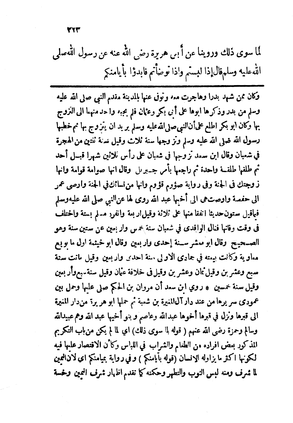 روى ابن سعد أن مروان بن الحكم صلى عليها وحمل بين عمودي سريرها من عند دار آل المغيرة بن شعبة ثم حملها أبو هريرة من دار المغيرة إلى قبرها ونزل في قبرها أخوها عبد الله وعاصم وبنو أخيها عبد الله وهم عبيد الله وسالم وحمزة رضي الله عنهم. قوله: (لما سوى ذلك) أي لما لم يكن من باب التكريم المذكور بعض أفراده من الطعام والشراب في اللباس وكأن الاقتصار عليها فيه لكونها أكثر ما يزاوله الإنسان. قوله: (بأيامنكم) وفي رواية بميامنكم أي لأن اليمين لما شرف ومنه