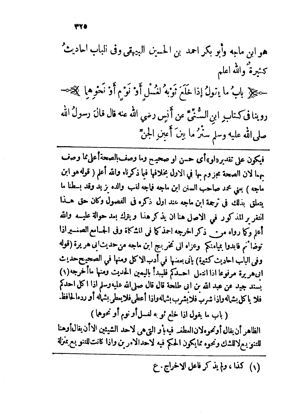 روينا في كتاب ابن السني، عن أنس رضي الله عنه قال: قال رسول الله - صلى الله عليه وسلم -: "سَتْرُ ما بيْنَ أعْيُنِ الجِنّ