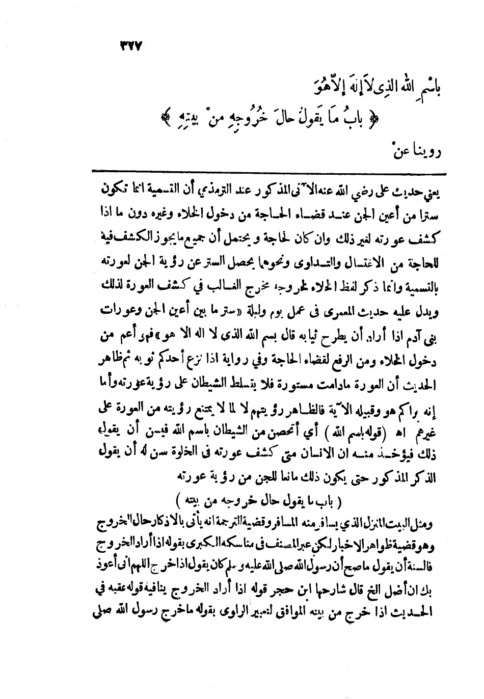 أتحصن من الشيطان باسم الله فيسن أن يقول ذلك فيؤخذ منه إن الإنسان متى كشف عورته في الخلوة سن له أن يقول الذكر المذكور حتى يكون ذلك مانعاً للجن من رؤية عورته.