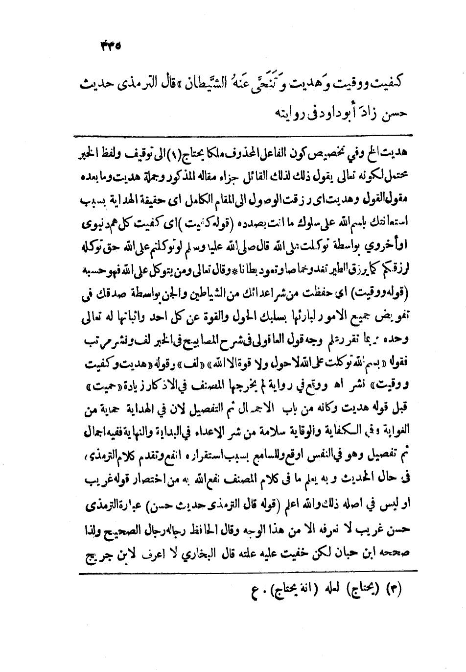 هديت إلخ، وفي تخصيص كون الفاعل المحذوف ملكا يحتاج إلى توقيف ولفظ الخبر محتمل لكونه تعالى يقول ذلك لذلك القائل جزاء مقاله المذكور وجملة هديت وما بعده مقول القول وهديت أي رزقت الوصول إلى المقام الكامل أي حقيقة الهداية بسبب استعانتك باسم الله على سلوك ما أنت بصدده. قوله: (كفيت) أي كفيت كل هم دنيوي أو أخروي بواسطة توكلت على الله قال - صلى الله عليه وسلم - لو توكلتم على الله حق توكله لرزقكم كما يرزق الطير تغدو خماصاً وتعود بطاناً وقال تعالى: {وَمَنْ يَتَوَكَّلْ عَلَى اللَّهِ فَهُوَ حَسْبُهُ} [الطلاق: 3] قوله: (ووقيت) أي حفظت من شر أعدائك من الشياطين والجن بواسطة صدقك في تفويض جميع الأمور لبارئها بسلبك الحول والقوة عن كل أحد وإثباتها له تعالى وحده وبما تقرر علم وجه قول العاقولي في شرح المصابيح في الخبر لف ونشر مرتب فقوله: "بسم الله توكلت على الله لا حول ولا قوة إلاَّ الله" "لف". و. قوله: (هديت وكفيت ووفيت) نشر اهـ، ووقع في رواية لم يخرجه المصنف في الأذكار زيادة "حميت" قبل قوله هديت وكأنه من باب الإجمال ثم التفصيل لأن في الهداية حماية من الغواية وفي الكفاية والوقاية سلامة من شر الأعداء في البداية والنهاية ففيه إجمال ثم تفصيل وهو في النفس أوقع وللسامع بسبب استقراره أنفع وتقدم كلام الترمذي في حال الحديث وبه يعلم ما في كلام المصنف نفع الله به من اختصار قوله غريب أو ليس في أصله ذلك والله أعلم. قوله: (قال الترمذي حديث حسن) عبارة الترمذي حسن غريب لا نعرف إلاّ من هذا الوجه وقال الحافظ رجاله رجال الصحيح ولذا صحح ابن حبان لكن خفيت عليه علته قال البخاري لا أعرف لابن جريج