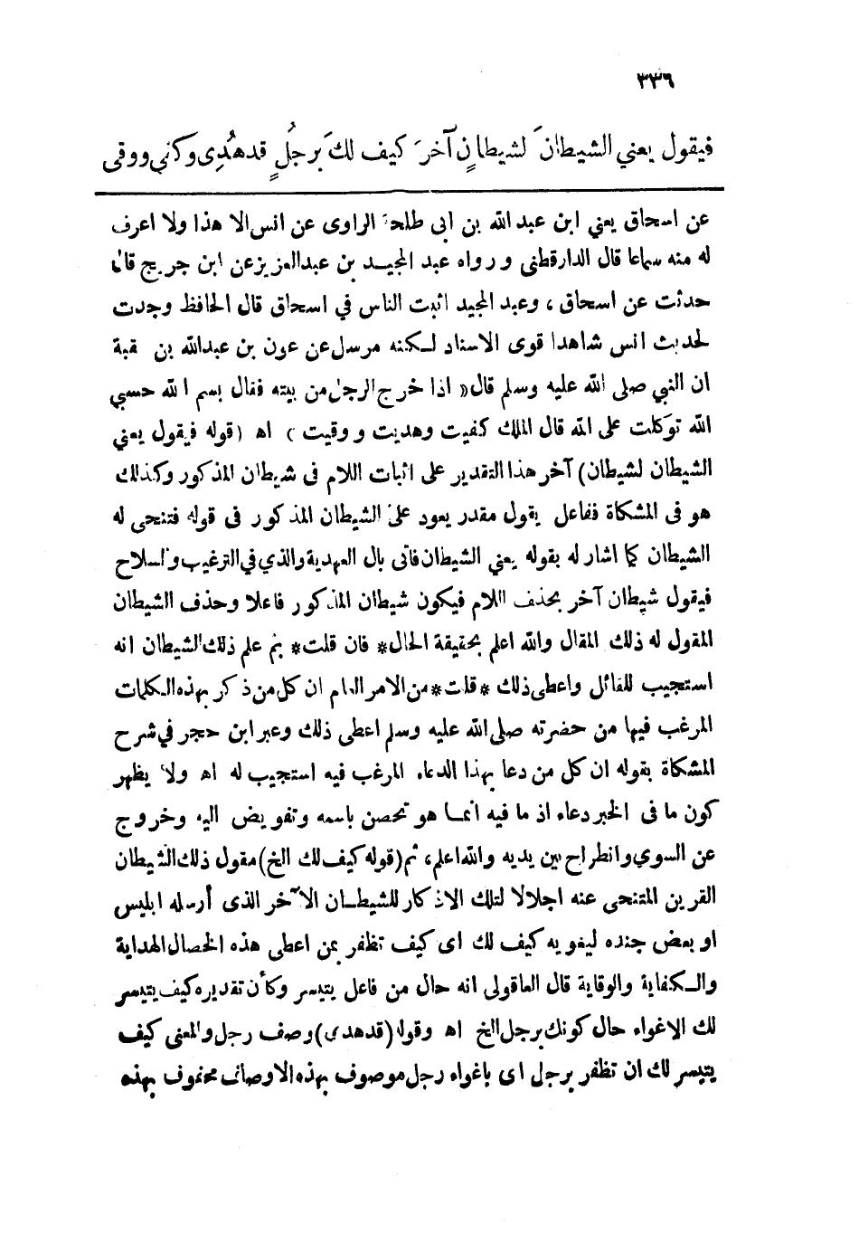 اللام فيكون شيطان المذكور فاعلاً وحذف الشيطان المقول له ذلك المقال والله أعلم بحقيقة الحال "فإن قلت" بم علم ذلك الشيطان أنه استجيب للقائل وأعطي ذلك "قلت" من الأمر العام أن كل من ذكر بهذه الكلمات المرغب فيها من حضرته - صلى الله عليه وسلم - أعطي ذلك وعبر ابن حجر في شرح المشكاة بقوله إن كل من دعا بهذا الدعاء المرغب فيه استجيب له اهـ، ولا يظهر كون ما في الخبر دعاء إذ ما فيه إنما هو تحصن باسمه وتفويض إليه وخروج عن السوي وانطراح بين يديه والله أعلم، ثم. قوله: (كيف لكَ إلخ) مقول ذلك الشيطان القرين المتنحى عنه إجلالاً لتلك الأذكار للشيطان الآخر الذي أرسله إبليس أو بعض جنده ليغويه كيف لك أي كيف تظفر بمن أعطي هذه الخصال الهداية والكفاية والوقاية قال العاقولي أنه حال من فاعل يتيسر وكأن تقديره كيف يتيسر لك الاغواء حال كونك برجل الخ اهـ. وقوله: (قد هُدِي) وصف رجل والمعنى كيف يتيسر لك إن تظفر برجل أي بإغواء رجل موصوف بهذه الأوصاف محفوف بهذه