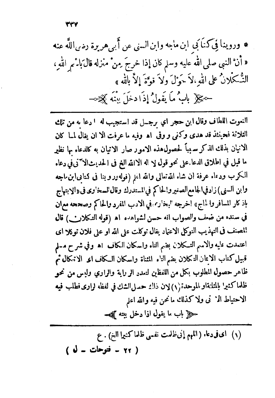 وروينا في كتابَي "ابن ماجة، وابن السني" عن أبي هريرة رضي الله عنه، أن النبي - صلى الله عليه وسلم - كان إذا خرج من منزله قال: "بِسْمِ اللهِ، التُّكْلان على اللهِ، لاَ حَوْلَ وَلَا قوةَ إلا باللَّهِ".