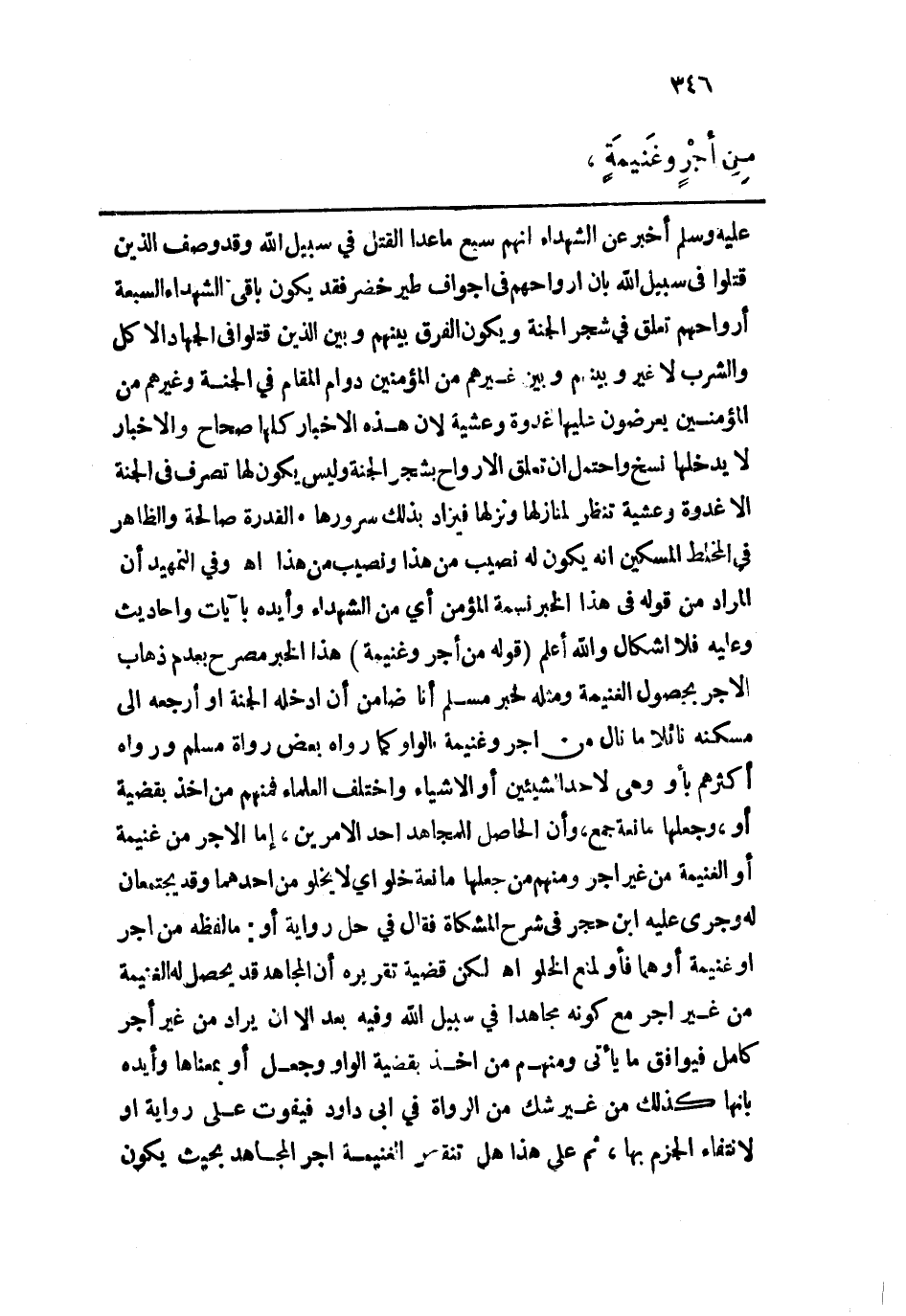 عليه وسلم - أخبر عن الشهداء أنهم سبع ما عدا القتل في سبيل الله وقد وصف الذين قتلوا في سبيل الله بأن أرواحهم في أجواف طير خضر فقد يكون باقي الشهداء السبعة أرواحهم تعلق في شجر الجنة ويكون الفرق بينهم وبين الذين قتلوا في الجهاد الأكل والشرب لا غير وبينهم وبين غيرهم من المؤمنين دوام المقام في الجنة وغيرهم من المؤمنين يعرضون عليها غدوة وعشية لأن هذه الأخبار كلها صحاح والأخبار لا يدخلها نسخ واحتمل إن تعلق الأرواح بشجر الجنة وليس يكون لها تصرف في الجنة إلاَّ غدوة وعشية تنظر لمنازلها ونزلها فيزاد بذلك سرورها والقدرة صالحة والظاهر في المخلط المسكين أنه يكون له نصيب من هذا ونصيب من هذا هـ. وفي التمهيد أن المراد من قوله في هذا الخبر نسمة المؤمن أي من الشهداء وأيده بآيات وأحاديث وعليه فلا إشكال والله أعلم. قوله: (مِن أجْرٍ وغَنيمَةٍ) هذا الخبر مصرح بعدم ذهاب الأجر بحصول الغنيمة ومثله لخبر مسلم أنا ضامن أن أدخله الجنة أو أرجعه إلى مسكنه نائلاً ما نال من أجر وغنيمة بالواو كما رواه بعض رواة مسلم ورواه أكثرهم بأو وهي لأحد الشيئين أو الأشياء واختلف العلماء فمنهم من أخذ بقضية أو وجعلها مانعة جمع، وأن الحاصل للمجاهد أحد الأمرين، إما الأجر من غنيمة أو الغنيمة من غير أجر ومنهم من جعلها مانعة خلو أي لا يخلو من أحدهما وقد يجتمعان له وجرى عليه ابن حجر في شرح المشكاة فقال في حل رواية أو: ما لفظه من أجر أو غنيمة أو هما فأو لمنع الخلو اهـ، لكن قضية تقريره أن المجاهد قد يحصل له الغنيمة من غير أجر مع كونه مجاهداً في سبيل الله وفيه بعد إلاَّ إن يراد من غير أجر كامل فيوافق ما يأتي ومنهم من أخذ بقضية الواو وجعل أو بمعناها وأيده بأنها كذلك من غير شك من الرواة في أبي داود فيفوت على رواية أو لانتفاء الجزم بها، ثم على هذا هل تنقص الغنيمة أجر المجاهد بحيث يكون