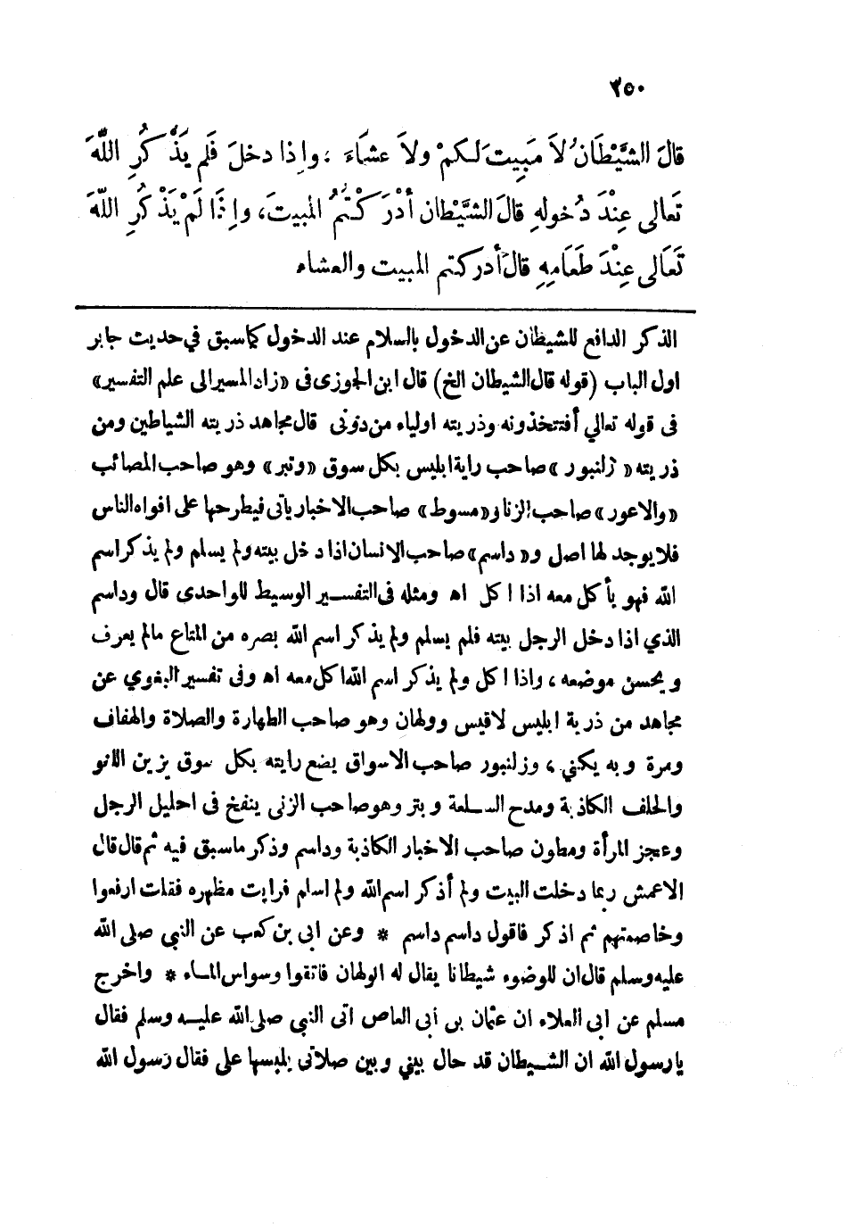 قال الشَّيْطَانُ: لاَ مَبِيتَ لَكُمْ وَلَا عَشَاءَ، وَإذا دَخَلَ فَلَمْ يَذْكُرِ اللهَ تَعالى عِنْدَ دُخولِهِ، قالَ الشَّيطانُ: أدْرَكْتمُ المَبِيتَ، وإذا لم يَذْكُرِ اللهَ تَعالى عِنْدَ طعامِهِ قال: أدْرَكْتُمُ المَبِيتَ والعَشَاءَ"