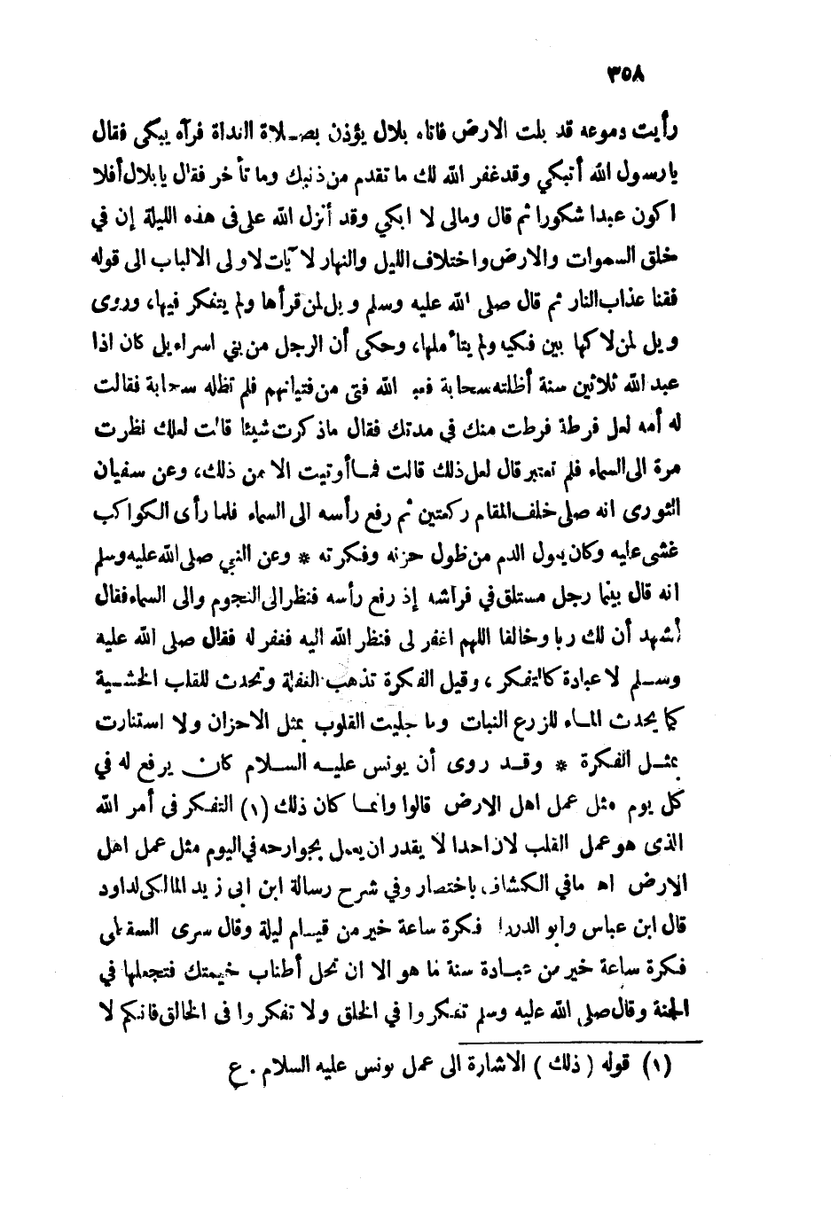 وقد روي أن يونس - عليه السلام - كان يرفع له في كل يوم مثل عمل أهل الأرض قالوا وإنما كان ذلك التفكر في أمر الله الذي هو عمل القلب لأن أحدا لا يقدر أن يعمل بجوارحه في اليوم مثل عمل أهل الأرض اهـ، أما في الكشاف باختصار وفي شرح رسالة ابن أبي زيد المالكي لداود قال ابن عباس وأبو الدرداء فكرة ساعة خير من فيام ليلة وقال سري السقطي فكرة ساعة خير من عبادة سنة ما هو إلَّا إن تحل أطناب خيمتك فتجعلها في الجنة وقال - صلى الله عليه وسلم - تفكروا في الخلق ولا تفكروا في الخالق فإنكم لا