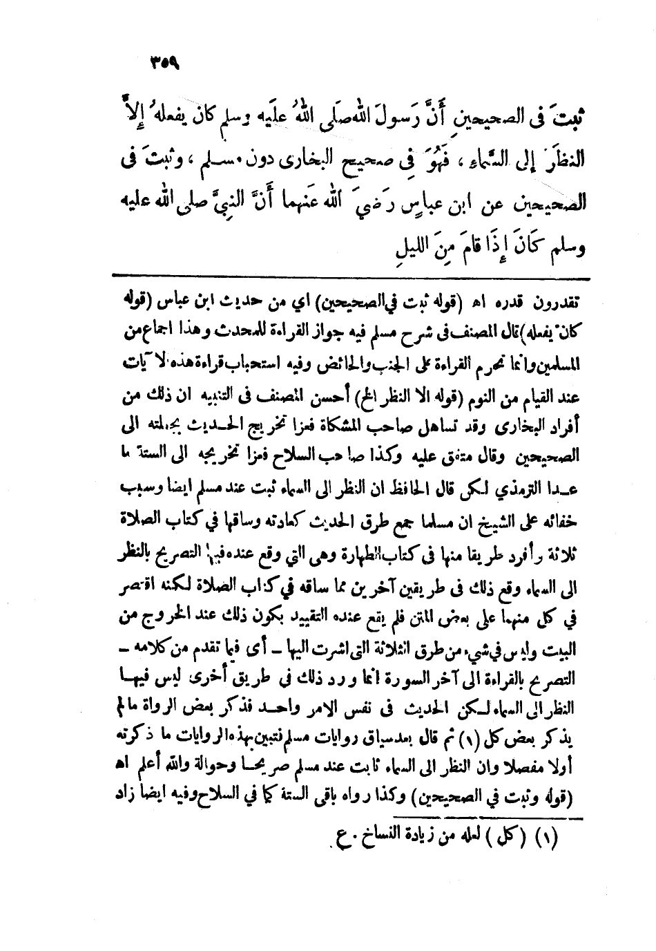 قوله: (ثبتَ في الصحيحينِ) أي من حديث ابن عباس. قوله: (كان يفعلهُ) قال المصنف في شرح مسلم فيه جواز القراءة للمحدث وهذا إجماع من المسلمين وإنما تحرم القراءة على الجنب والحائض وفيه استحباب قراءة هذه الآيات عند القيام من النوم. قوله: (إلا النظَر إلخ) أحسن المصنف في التنبيه إن ذلك من أفراد البخاري وقد تساهل صاحب المشكاة فعزا تخريج الحديث بجملته إلى الصحيحين وقال متفق عليه وكذا صاحب السلاح فعزا تخريجه إلى الستة ما عدا الترمذي لكن قال الحافظ إن النظر إلى السماء ثبت عند مسلم أيضًا وسبب خفائه على الشيخ إن مسلما جمع طرق الحديث كعادته وساقها في كتاب الصلاة ثلاثة وأفرد طريقًا منها في كتاب الطهارة وهي التي وقع عنده فيها التصريح بالنظر إلى السماء وقع ذلك في طريقين آخرين مما ساقه في كتاب الصلاة لكنه اقتصر في كل منهما على بعض المتن فلم يقع عنده التقييد يكون ذلك عند الخروج من البيت وليس في شيء من طرق الثلاثة التي أشرت إليها -أي فيما تقدم من كلامه- التصريح بالقراءة إلى آخر السورة إنما ورد ذلك في طريق أخرى ليس فيها النظر إلى السماء لكن الحديث في نفس الأمر واحد فذكر بعض الرواة ما لم يذكر بعض كل ثم قال بعد سياق روايات مسلم فتبين بهذه الروايات ما ذكرته أولًا مفصلًا وإن النظر إلى السماء ثابت عند مسلم صريحًا وحوالة والله أعلم اهـ.