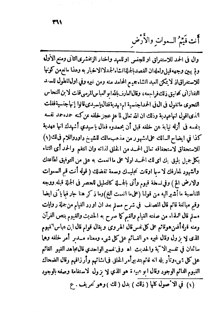 وفي الحمد للاستغراق أو للجنس أو للعهد واختار الزمخشري الثاني ومنع الأول ولم يبين وجهه قيل ولعله إن القصد بالجملة إنشاء الحمد لا الإخبار به وهذا مانع من كونها للاستغراق إذ لا يمكن العبد إنشاء جميع المحامد منه ومن غيره وفي أول المطول للسند التفتازاني تحقيق ذلك فراجعه، وقال العارف بالله أبو العباس المرسي قلت لابن النحاس النحوي ما تقول في ال في الحمد أجنسية أم عهدية فقال يا سيدي قالوا إنها جنسية فقلت الذي أقول أنها عهدية وذلك إن الله تعالى لما علم عجز خلقه عن كنه حمده حمد نفسه بنفسه في أزله نيابة عن خلقه قبل أن يحمدوه فقال يا سيدي أشهدك أنها عهدية كذا في إيضاح السالك على المشهور من مذهب مالك للشيخ داود واللام في لك للاستحقاق لاستحقاقه تعالى الحمد من الخلق لذاته وإن انتقم والحمد أي الثناء بكل جميل يليق بك أي لك الحمد أولًا على ما أنعمت به علي من التوفيق لطاعتك والشهود لمعارفك لا سيما أوقات تجليك وسعة تفضلك. قوله: (أَنت قيم السمواتِ والأَرْضِ إلخ) وفي نسخة قيوم وأتى بالجملة كالتعليل للحصر في الجملة قبله ووجه المناسبة مما أشير إليه من قولًا: (على ما أنعمت إلخ) وما ذكر هنا جار فيما يأتي أيضًا وقيم مبالغة قائم قال المصنف في شرح مسلم بعد أن أورد القيام من جملة روايات مسلم قال العلماء من صفته القيام والقيم كما صرح به الحديث والقيوم بنص القرآن ومنه قوله: ({أَفَمَنْ هُوَ قَائِمٌ عَلَى كُلِّ نَفْسٍ} [الرعد: 33] قال الهروي ويقال قوام قال ابن عباس القيوم الذي لا يزول وقال غيره هو القائم على كل شيء ومعناه مدبر أمر خلقه وهما سائغان في تفسير الآية والحديث اهـ. وفي تفسير الواحدي قال مجاهد القيوم القائم على كل شيء وتأويله أنه قائم بتدير أمر الخلق في إنشائهم وإرزاقهم وقال الضحاك القيوم الدائم الوجود وقال أبو عبيدة هو