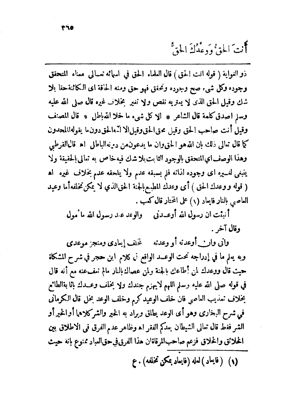 وبه يعلم ما في إدراجه تحت الوعد الواقع في كلام ابن حجر في شرح المشكاة حيث قال ووعدك لمن أطاعك بالجنة ولمن عصاك بالنار ما لم تعف عنه مع أنه قال في قوله - صلى الله عليه وسلم - اللهم لا يهزم جندك ولا يخلف وعدك بإثابة الطائع بخلاف تعذيب العاصي فإن خلف الوعيد كرم وخلف الوعد بخل قال الكرماني في شرح البخاري وهو أي الوعد يطلق ويراد به الخير والشر كلاهما أو الخير أو الشر فقط قال تعالى: {الشَّيطانُ يَعِدُكُمُ الفَقْرَ} [البقرة: 268] وظاهر عدم الفرق في الإطلاق بين الخلائق والخلاق فزعم صاحب المرقاة إن هذا الفرق في حق العباد ممنوع بأنه حيث