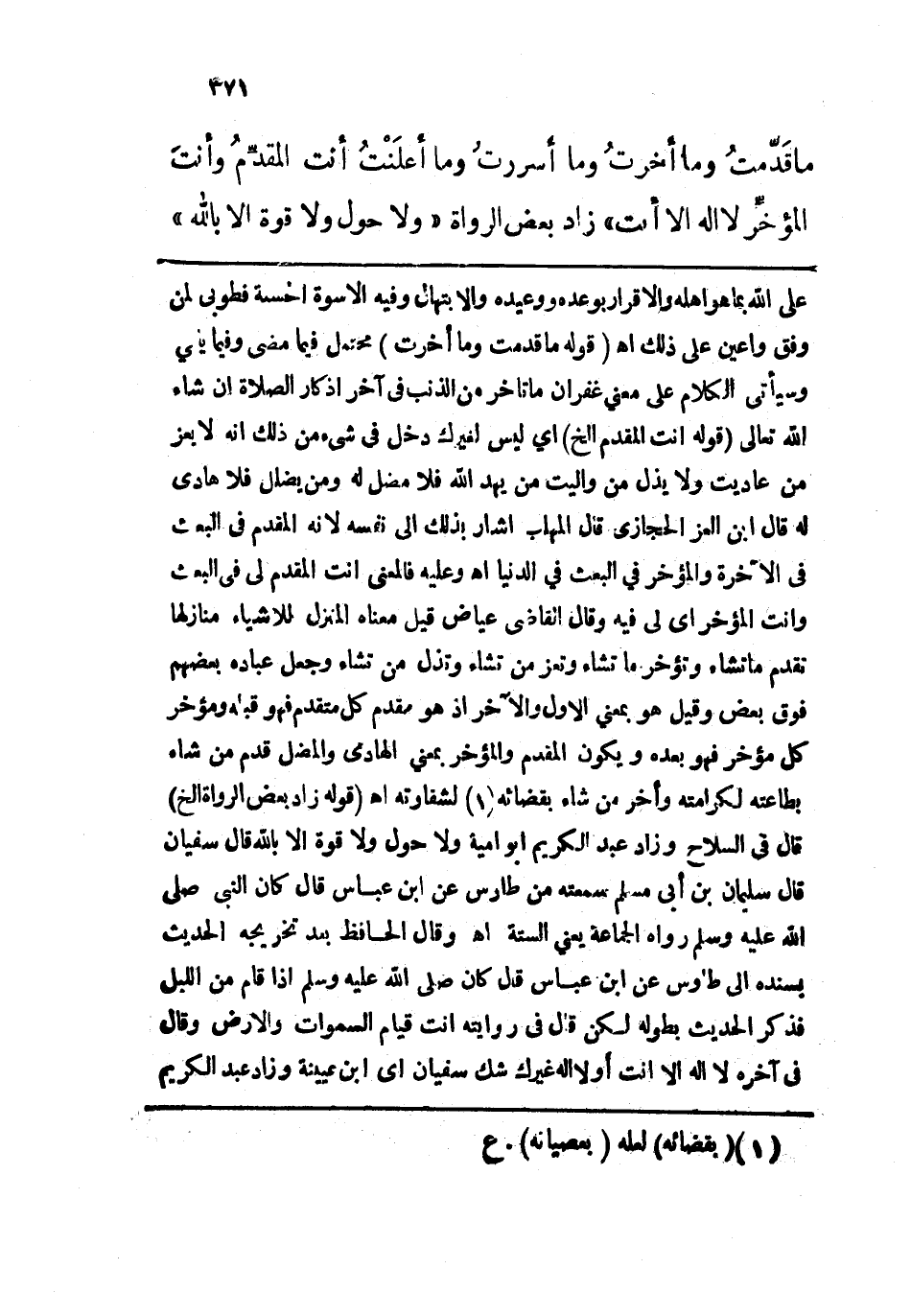 على الله بما هو أهله والإقرار بوعده ووعيده والابتهال وفيه الأسوة الحسنة فطوبى لمن وفق وأعين على ذلك اهـ. قوله: (ما قَدّمتُ وما أَخرتُ) محتمل فيما مضى وفيما يأتي وسيأتي الكلام على معنى غفران ما تأخر من الذنب في آخر أذكار الصلاة إن شاء الله تعالى. قوله: (أنت المقدِّمُ إلخ) أي ليس لغيرك دخل في شيء من ذلك أنه لا يعز من عاديت ولا يذل من واليت من يهدي الله فلا مضل له ومن يضلل فلا هادي له قال ابن العز الحجازي قال المهلب أشار بذلك إلى نفسه لأنه المقدم في البعث في الآخرة والمؤخر في البعث في الدنيا اهـ، وعليه فالمعنى أنت المقدم لي في البعث وأنت المؤخر أي لي فيه وقال القاضي عياض قيل معناه المنزل للأشياء منازلها تقدم ما تشاء وتؤخر ما تشاء وتعز من تشاء وتذل من تشاء وجعل عباده بعضهم فوق بعض وقيل هو بمعنى الأول والآخر إذ هو مقدم كل متقدم فهو قبله ومؤخر كل مؤخر فهو بعده ويكون المقدم والمؤخر بمعنى الهادي والمضل قدم من شاء بطاعته لكرامته وأخر من شاء بقضائه لشقاوته اهـ. قوله: (زاد بعض الرواة إلخ) قال في السلاح وزاد عبد الكريم أبو أمية ولا حول ولا قوة إلَّا بالله قال سفيان قال سليمان بن أبي مسلم سمعته من طاوس عن ابن عباس قال كان النبي - صلى الله عليه وسلم - رواه الجماعة يعني الستة اهـ. وقال الحافظ بعد تخريجه الحديث بسنده إلى طاوس عن ابن عباس قال كان - صلى الله عليه وسلم - إذا قام من الليل فذكر الحديث بطوله لكن قال في روايته أنت قيام السموات والأرض وقال في آخره لا إله إلَّا أنت أو لا إله غيرك شك سفيان أي ابن عيينة وزاد عبد الكريم