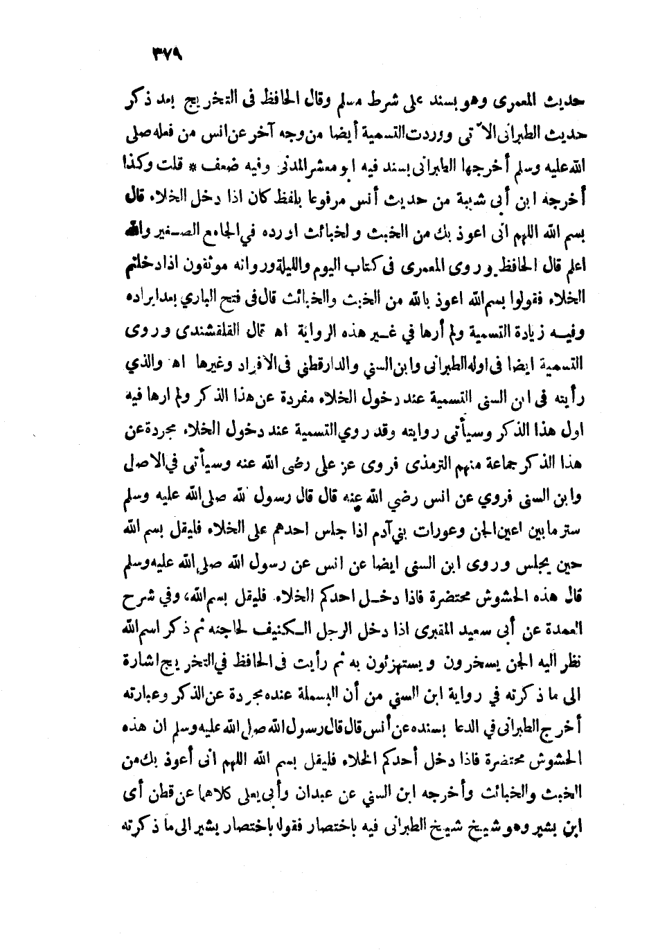 قلت وكذا أخرجه ابن أبي شيبة من حديث أنس مرفوعًا بلفظ كان إذا دخل الخلاء قال بسم الله اللهم إني أعوذ بك من الخبث والخبائث أورده في الجامع الصغير والله أعلم. قال الحافظ وروى المعمري في كتاب اليوم والليلة ورواته موثقون إذا دخلتم الخلاء فقولوا بسم الله أعوذ بالله من الخبث والخبائث قال في فتح الباري بعد إيراده وفيه زيادة التسمية ولم أرها في غير هذه الرواية اهـ. قال القلقشندي وروى التسمية أيضًا في أوله الطبراني وابن السني والدارقطني في الأفراد وغيرها اهـ، والذي رأيته في ابن السني التسمية عند دخول الخلاء مفردة عن هذا الذكر ولم أرها فيه أول هذا الذكر وسيأتي روايته وقد روى التسمية عند دخول الخلاء مجردة عن هذا الذكر جماعة منهم الترمذي فروي عن علي رضي الله عنه وسيأتي في الأصل وابن السني فروي عن أنس رضي الله عنه قال قال رسول الله - صلى الله عليه وسلم - ستر ما بين أعين الجن وعورات بني آدم إذا جلس أحدهم على الخلاء فليقل بسم الله حين يجلس وروى ابن السني أيضًا عن أنس عن رسول الله - صلى الله عليه وسلم - قال هذه الحشوش محتضرة فإذا دخل أحدكم الخلاء فليقل بسم الله، وفي شرح العمدة عن أبي سعيد المقبري إذا دخل الرجل الكنيف لحاجته ثم ذكر اسم الله نظر إليه الجن يسخرون ويستهزئون به ثم رأيت في الحافظ في التخريج إشارة إلى ما ذكرته في رواية ابن السني من أن البسملة عنده مجردة عن الذكر وعبارته أخرج الطبراني في الدعاء بسنده عن أنس قال قال رسول الله - صلى الله عليه وسلم - إن هذه الحشوش محتضرة فإذا دخل أحدكم الخلاء فليقل بسم الله اللهم إني أعوذ بك من الخبث والخبائث وأخرجه ابن السني عن عبدان وأبي يعلى