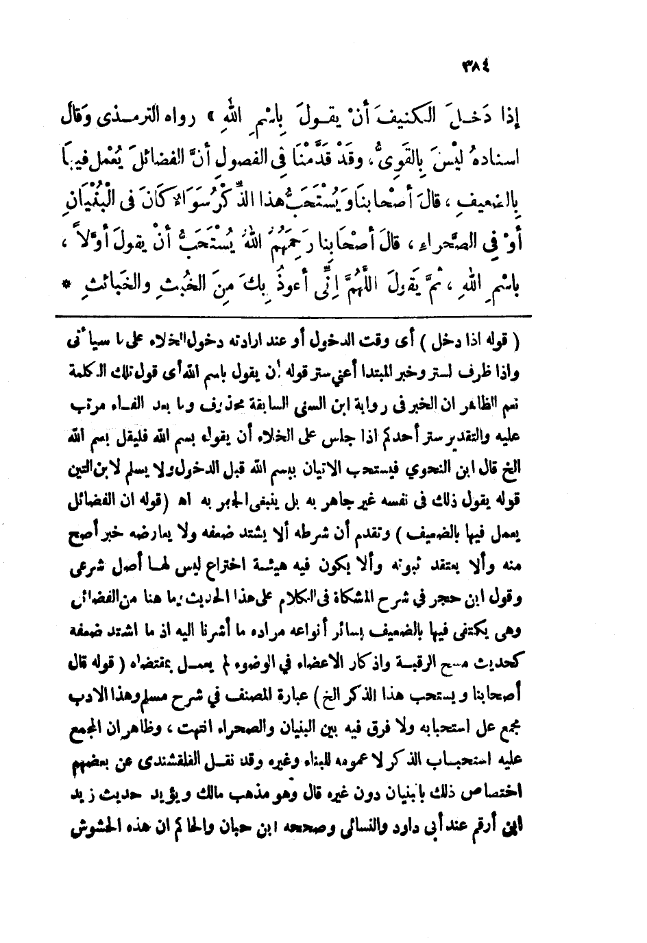 إذا دخلَ الكنِيفَ أنْ يَقُولَ: بسْم اللهِ" رواه الترمذي وقال: إسناده ليس بالقوي، وقد قدمنا في الفصول أن الفضائل يعمل فيها بالضعيف. قال أصحابنا: ويُستحبُّ هذا الذِّكْر سواء كان في البنيان أو في الصحراء، قال أصحابنا رحمهم الله: يُستحبُّ أن يقول أولًا: "بِسْمِ اللهِ" ثم يقول: "اللهُم إني أعُوذُ بِكَ مِنَ الخُبْثِ والخبائِثِ".