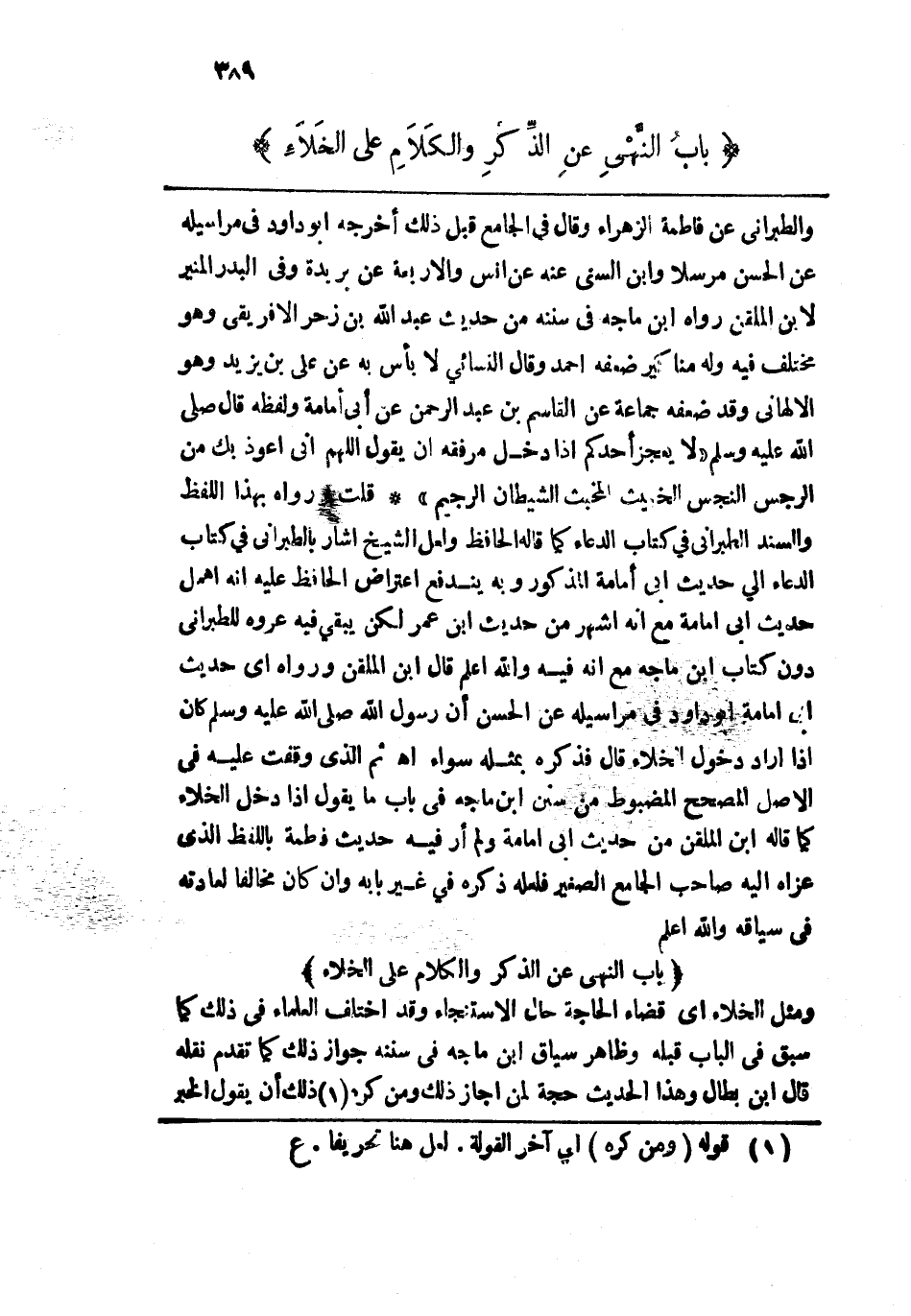 قلت ورواه بهذا اللفظ والسند الطبراني في كتاب الدعاء كما قاله الحافظ ولعل الشيخ أشار بالطبراني في كتاب الدعاء إلى حديث أبي أمامة المذكور وبه يندفع اعتراض الحافظ عليه أنه أهمل حديث أبي أمامة مع أنه أشهر من حديث ابن عمر لكن يبقى فيه عزوه للطبراني دون كتاب ابن ماجة مع أنه فيه والله أعلم، قال ابن الملقن ورواه أي حديث أبي أمامة أبو داود في مراسيله عن الحسن أن رسول الله - صلى الله عليه وسلم - كان إذا أراد دخول الخلاء قال فذكره بمثله سواء اهـ، ثم الذي وقفت عليه في الأصل