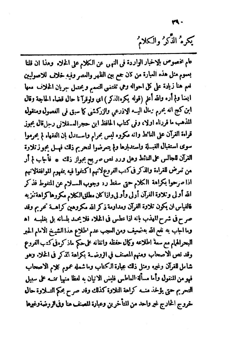 فأجاب لم أر من تعرض للقراءة والذكر في كتب الفروع لأنهم اكتفوا فيه بمفهوم الموافقة لأنهم إذا صرحوا بكراهة الكلام حتى سقط رد وجوب السلام عن المتغوط فذكر الله أولى وتلاوة القرآن أولى وأولى وإذا كان مطلق الكلام مكروهًا كراهة تنزيه فالقياس إن يكون تلاوة القرآن ومداومة ذكر الله مكروهين كراهة تحريم وقد صرح في شرح المهذب بأنه إذا عطس في الخلاء فلا يحمد بلسانه بل بقلبه اهـ، وما أجاب به نفع الله به ضعيف ومن العجب عدم اطلاع هذا الشيخ الإمام الحبر البحر الهمام مع سعة اطلاعه وكمال حفظه وإتقانه على حكم ما ذكره في كتب الفروع وقد نص الأصحاب ومنهم المصنف في الروضة بكراهة الذكر في الخلاء وهو شامل للقرآن وغيره ومثل ذلك عبارة الكتاب وما شمله عموم كلام الأصحاب فهو من المنقول وأما مسألة العاطس فليس الإتيان به لفظًا منهيًّا عنه على سببل التحريم حتى يؤخذ منه كراهة التلاوة كذلك وقد صرح بحكم التلاوة حال خروج الخارج غير واحد من المتأخرين وعبارة المصنف هنا وفي الروضة وغيرها