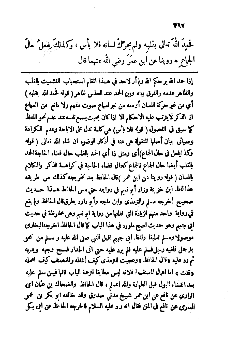 إذا حمد الله يرى حكم الله ولم أر لأحد في هذا المقام استحباب التشميت بالقلب والظاهر عدمه والفرق بينه وبين الحمد عند العطس ظاهر. قوله: (فحمِدَ الله تعالى بقلبِهِ) أي من غير حركة اللسان أو معه من غير إسماع صوت مفهم ولا مانع من السماع إذ الذكر لا يترتب عليه الأحكام إلّا إذا كان بحيث يسمع نفسه عند عدم نحو اللفظ كما سبق في الفصول. قوله: (فلا بأس) هي كلمة تدل على الإباحة وعدم الكراهة وسيأتي بيان أصلها المنقولة هي عنه في أذكار الوضوء إن شاء الله تعالى. قوله: (وكذا يفعلُ حال الجماع) أي ومثل ذا أي الحمد بالقلب حال قضاء الحاجة الحمد بالقلب أيضًا حال الجماع، فالجماع كحال قضاء الحاجة في كراهة الذكر والكلام باللسان.