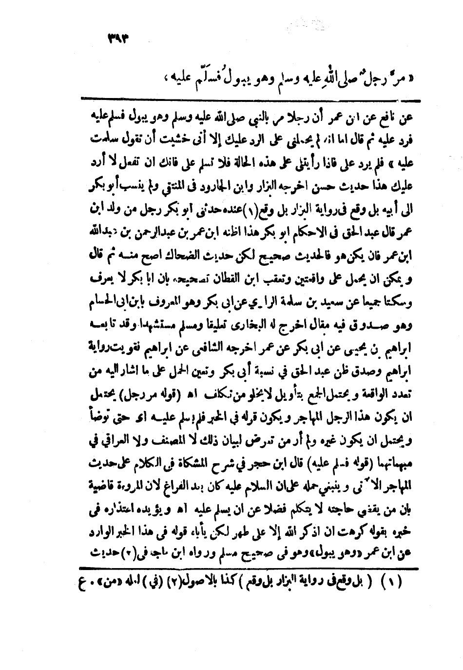 عن نافع عن ابن عمر أن رجلًا مر بالنبي - صلى الله عليه وسلم - وهو يبول فسلم عليه فرد عليه ثم قال أما أنه لم يحملني على الرد عليك إلَّا أني خشيت أن تقول "سلمت عليه" فلم يرد عليّ فإذا رأيتني على هذه الحالة فلا تسلم عليّ فإنك إن تفعل لا أرد عليك هذا حديث حسن أخرجه البزار وابن الجارود في المنتقى ولم ينسب أبو بكر إلى أبيه بل وقع في رواية البزار بل وقع