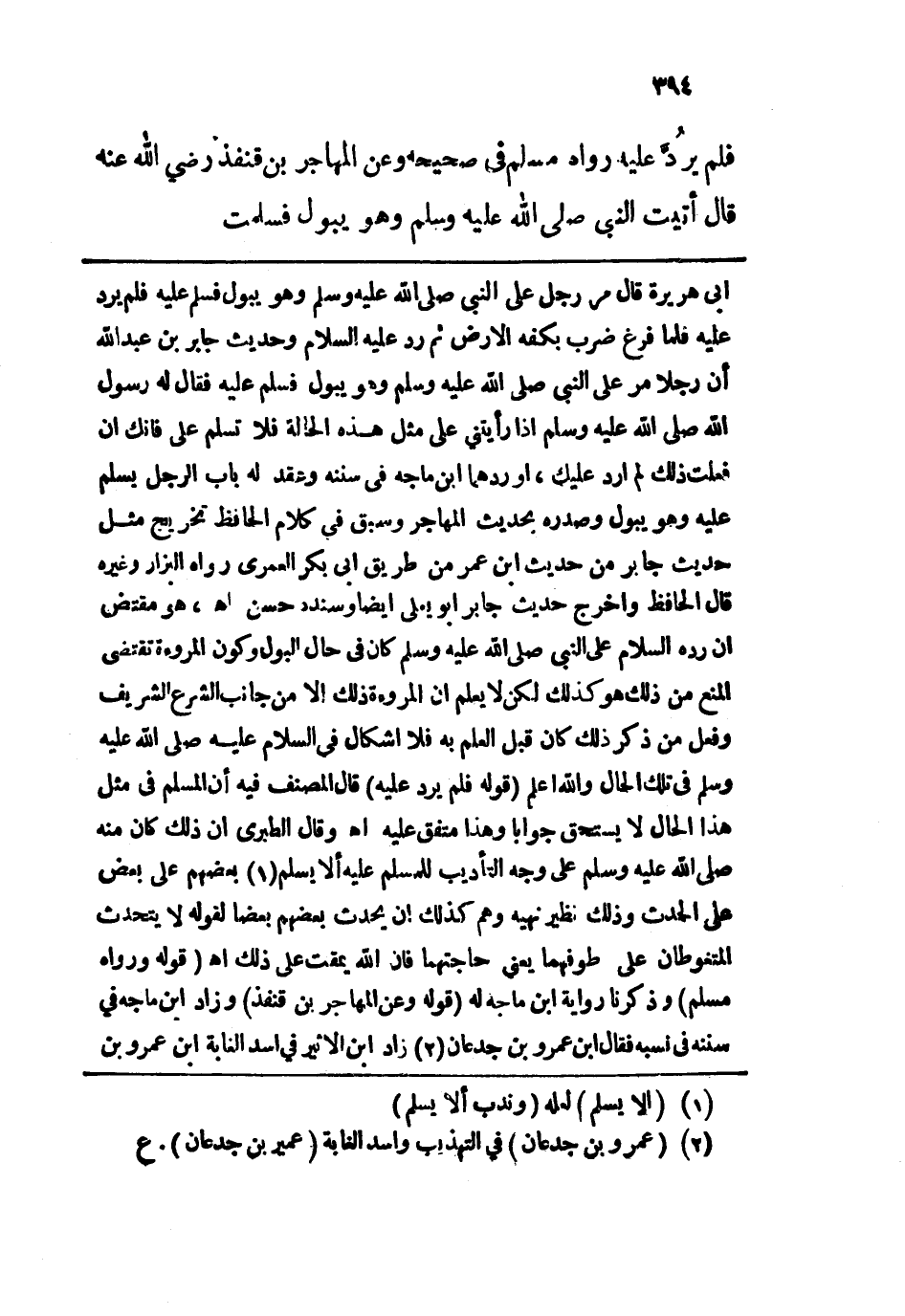 أبي هريرة قال مر رجل على النبي - صلى الله عليه وسلم - وهو يبول فسلم عليه فلم يرد عليه فلما فرغ ضرب بكفه الأرض ثم رد - عليه السلام - وحديث جابر بن عبد الله أن رجلًا مر على النبي - صلى الله عليه وسلم - وهو يبول فسلم عليه فقال له رسول الله - صلى الله عليه وسلم - إذا رأيتني على مثل هذه الحالة فلا تسلم عليّ فإنك إن فعلت ذلك لم أرد عليك، أوردهما ابن ماجة في سننه وعقد له باب الرجل يسلم عليه وهو يبول وصدره بحديث المهاجر وسبق في كلام الحافظ تخريج مثل حديث جابر من حديث ابن عمر من طريق أبي بكر العمري رواه البزار وغيره قال الحافظ وأخرج حديث جابر أبو يعلى أيضًا وسنده حسن اهـ، هو مقتض إن رده السلام على النبي - صلى الله عليه وسلم - كان في حال البول وكون المروءة تقتضي المنع من ذلك هو كذلك لكن لا يعلم إن المروءة ذلك إلّا من جانب الشرع الشريف وفعل من ذكر ذلك كان قبل العلم به فلا إشكال في السلام عليه - صلى الله عليه وسلم - في تلك الحال والله أعلم. قوله: (فلم يُردَّ عليه) قال المصنف فيه إن المسلم في مثل هذا الحال لا يستحق جوابًا وهذا متفق عليه اهـ. وقال الطبري إن ذلك كان منه - صلى الله عليه وسلم - على وجه التأديب للمسلم عليه ألا يسلم بعضهم على بعض على الحدث وذلك نظير نهيه وهم كذلك إن يحدث بعضهم بعضًا لقوله لا يتحدث المتغوطان على طوفهما يعني حاجتهما فإن الله يمقت على ذلك اهـ. قوله: (ورواه مسلم) وذكرنا رواية ابن ماجة له. قوله: (وعن المهاجر بن قنفذ) وزاد ابن ماجة في سننه في نسبه فقال ابن عمرو بن جدعان زاد ابن الأثير في أسد الغابة ابن عمرو بن