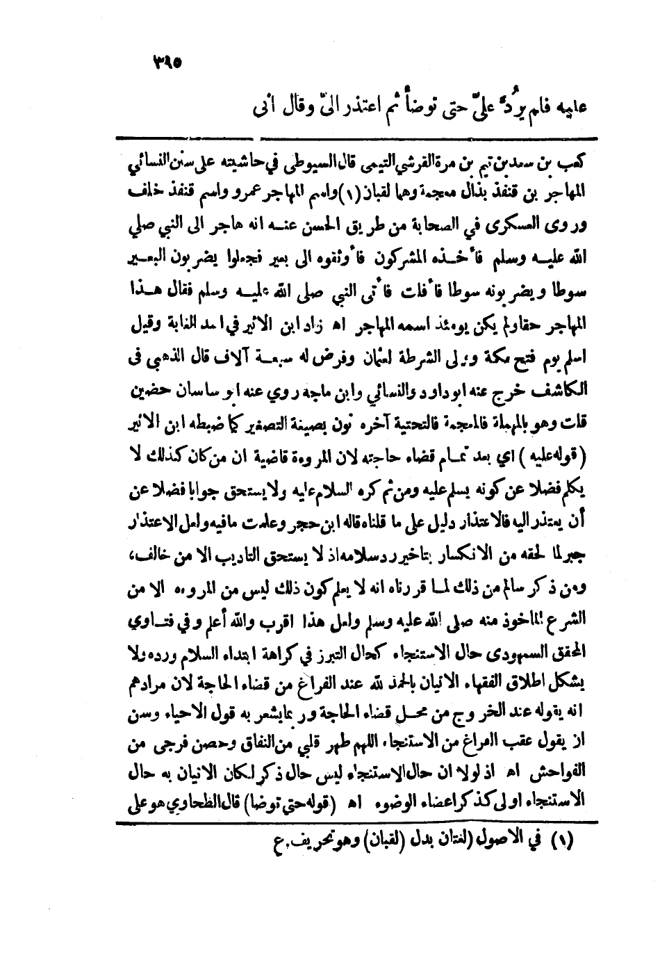 المهاجر حقًّا ولم يكن يومئذٍ اسمه المهاجر اهـ، زاد ابن الأثير في أسد الغابة وقيل أسلم يوم فتح مكة وولى الشرطة لعثمان وفرض له سبعة الآف قال الذهبي في الكاشف خرج عنه أبو داود والنسائي وابن ماجة روى عنه أبو ساسان حضين قلت وهو بالمهملة فالمعجمة فالتحتية آخره نون بصيغة التصغير كما ضبطه ابن الأثير. قوله: (عليه) أي بعد تمام قضاء حاجته لأن المروءة قاضية إن من كان كذلك لا يكلم فضلًا عن كونه يسلم عليه ومن ثم كره السلام عليه ولا يستحق جوابًا فضلًا عن أن يعتذر إليه فالاعتذار دليل على ما قلناه قاله ابن حجر وعلمت ما فيه ولعل الاعتذار جبر لما لحقه من الانكسار بتأخير رد سلامه إذ لا يستحق التأديب إلَّا من خالف، ومن ذكر سالم من ذلك لما قررناه أنه لا يعلم كون ذلك ليس من المروءة إلَّا من الشرع المأخوذ منه - صلى الله عليه وسلم - ولعل هذا أقرب والله أعلم، وفي فتاوي المحقق السمهودي حال الاستنجاء كحال التبرز في كراهة ابتداء السلام ورده ولا يشكل إطلاق الفقهاء الإتيان بالحمد لله عند الفراغ من قضاء الحاجة لأن مرادهم أنه يقوله عند الخروج من محل قضاء الحاجة وربما يشعر به قولًا الإحياء وسن أن يقول عقب الفراغ من الاستنجاء اللهم طهر قلبي من النفاق وحصن فرجي من الفواحش اهـ، إذ لولا إن حال الاستنجاء ليس حال ذكر لكان الإتيان به حال الاستنجاء أولى كذكر أعضاء الوضوء اهـ. قوله: (حتى توضأ) قال الطحاوي هو على