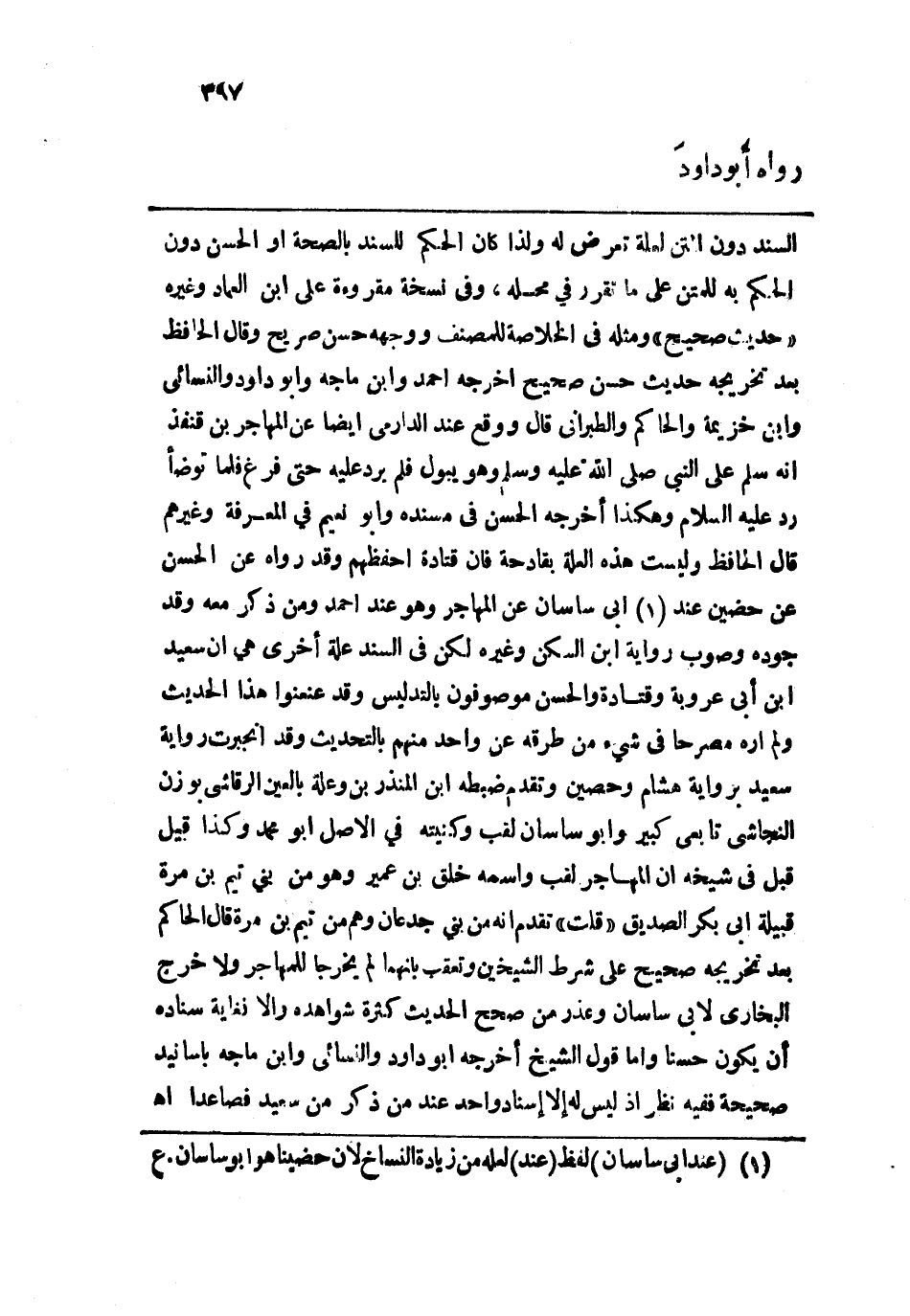 الحكم للسند بالصحة أو الحسن دون الحكم به للمتن على ما تقرر في محله، وفي نسخة مقروءة على ابن العماد وغيره "حديث صحيح" ومثله في الخلاصة للمصنف ووجهه حسن صريح وقال الحافظ بعد تخريجه حديث حسن صحيح أخرجه أحمد وابن ماجة وأبو داود والنسائي وابن خزيمة والحاكم والطبراني قال. ووقع عند الدارمي أيضًا عن المهاجر بن قنفذ أنه سلم على النبي - صلى الله عليه وسلم - وهو يبول فلم يرد عليه حتى فرغ فلما توضأ رد - عليه السلام - وهكذا أخرجه الحسن في مسنده وأبو نعيم في المعرفة وغيرهم قال الحافظ وليست هذه العلة بقادحة فإن قتادة أحفظهم وقد رواه عن الحسن عن حضين عند أبي ساسان عن المهاجر وهو عند أحمد ومن ذكر معه وقد جوده وصوب رواية ابن السكن وغيره لكن في السند علة أخرى هي إن سعيد بن أبي عروبة وقتادة والحسن موصوفون بالتدليس وقد عنعنوا هذا الحديث ولم أره مصرحا في شيء من طرقه عن واحد منهم بالتحديث وقد انجبرت رواية سعيد برواية هشام وحصين وتقدم ضبطه ابن المنذر بن وعلة بالعين الرقاشي بوزن النجاشي تابعي كبير وأبو ساسان لقب وكنيته في الأصل أبو محمد وكذا قيل قبل في شيخه إن المهاجر لقب واسمه خلق بن عمير وهو من بني تيم بن مرة قبيلة أبي بكر الصديق "قلت" تقدم أنه من بني جدعان وهم من تيم بن مرة قال الحاكم بعد تخريجه صحيح على شرط الشيخين وتعقب بأنهما لم يخرجا للمهاجر ولا خرج البخاري لأبي ساسان وعذر من صحح الحديث كثرة شواهده وإلَّا فغاية إسناده أن يكون حسنًا وأما قول الشيخ أخرجه أبو داود والنسائي وابن ماجة بأسانيد صحيحة ففيه نظر إذ ليس له إلَّا إسناد واحد عند من ذكر من سعيد فصاعدا اهـ.