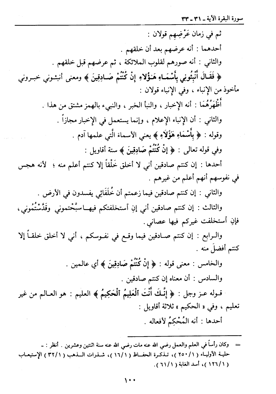 ثم في زمان عرْضِهِم قولان: أحدهما: أنه عرضهم بعد أن خلقهم. والثاني: أنه صورهم لقلوب الملائكة , ثم عرضهم قبل خلقهم. {فَقَالَ أَنْبِئُونِي بِأَسْمَاءِ هَؤُلاءِ إنْ كُنْتُمْ صَادِقِينَ} ومعنى أنبئوني خبروني مأخوذ من الإنباء , وفي الإنباء قولان: أَظْهَرُهُمَا: أنه الإخبار , والنبأ الخبر , والنبيء بالهمز مشتق من هذا. والثاني: أن الإنباء الإعلام , وإنما يستعمل في الإخبار مجازاً. وقوله: {بِأَسْمَاءِ هَؤُلاَءِ} يعني الأسماءَ الَّتي علمها آدم. وفي قوله تعالى: {إنْ كُنْتُمْ صَادِقِينَ} ستة أقاويل: أحدها: إن كنتم صادقين أني لا أخلق خَلْقاً إلا كنتم أعلم منه؛ لأنه هجس في نفوسهم أنهم أعلم من غيرهم. والثاني: إن كنتم صادقين فيما زعمتم أن خُلَفَائي يفسدون في الأرض. والثالث: إن كنتم صادقين أني إنِ استخلفتكم فيها سبَّحْتموني وقَدَّسْتُمُوني , فإن استخلفت غيركم فيها عصاني. والرابع: إن كنتم صادقين فيما وقع في نفوسكم , أني لا أخلق خلقاً إلا كنتم أفضل منه. والخامس: معنى قوله: {إِنْ كُنْتُمْ صَادِقِينَ} أي عالمين. والسادس: أن معناه إن كنتم صادقين. قوله عز وجل: {إِنَّكَ أَنْتَ الْعَلِيمُ الْحَكِيمُ} العليم: هو العالم من غير تعليم , وفي (الحكيم) ثلاثة أقاويل: أحدها: أنه المُحْكِمُ لأفعاله.