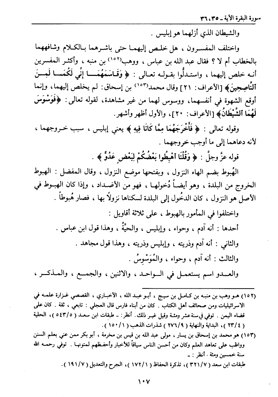 والشيطان الذي أزلهما هو إبليس. واختلف المفسرون , هل خلص إليهما حتى باشرهما بالكلام وشافههما بالخطاب أم لا؟ فقال عبد الله بن عباس , ووهب بن منبه , وأكثر المفسرين أنه خلص إليهما , واستدلُّوا بقوله تعالى: {وَقَاسَمَهُمَا إِنِّي لَكُمَا لَمِنَ النَّاصِحِينَ} [الأعراف: 21] وقال محمد بن إسحاق: لم يخلص إليهما , وإنما أوقع الشهوة في أنفسهما , ووسوس لهما من غير مشاهدة , لقوله تعالى: {فَوَسْوَسَ لَهُمَا الشَّيْطَانُ} [الأعراف: 20] , والأول أظهر وأشهر. وقوله تعالى: {فَأَخْرجَهُمَا مِمَّا كَانَا فِيهِ} يعني إبليس , سبب خروجهما , لأنه دعاهما إلى ما أوجب خروجهما. قوله عزَّ وجلَّ: {وَقُلْنَا اهْبِطُوا بَعْضُكُمْ لِبَعْضٍ عَدُوٌّ}. الهُبوط بضم الهاء النزول , وبفتحها موضع النزول , وقال المفضل: الهبوط الخروج من البلدة , وهو أيضاً دُخولها , فهو من الأضداد , وإذا كان الهبوط في الأصل هو النزول , كان الدخُول إلى البلدة لسكناها نزولاً بها , فصار هُبوطاً. واختلفوا في المأمور بالهبوط , على ثلاثة أقاويل: أحدها: أنه آدم , وحواء , وإبليس , والحيَّةُ , وهذا قول ابن عباس. والثاني: أنه آدم وذريته , وإبليس وذريته , وهذا قول مجاهد. والثالث: أنه آدم , وحواء , والمُوَسْوِسُ. والعدو اسم يستعمل في الواحد , والاثنين , والجمع , والمذكر ,