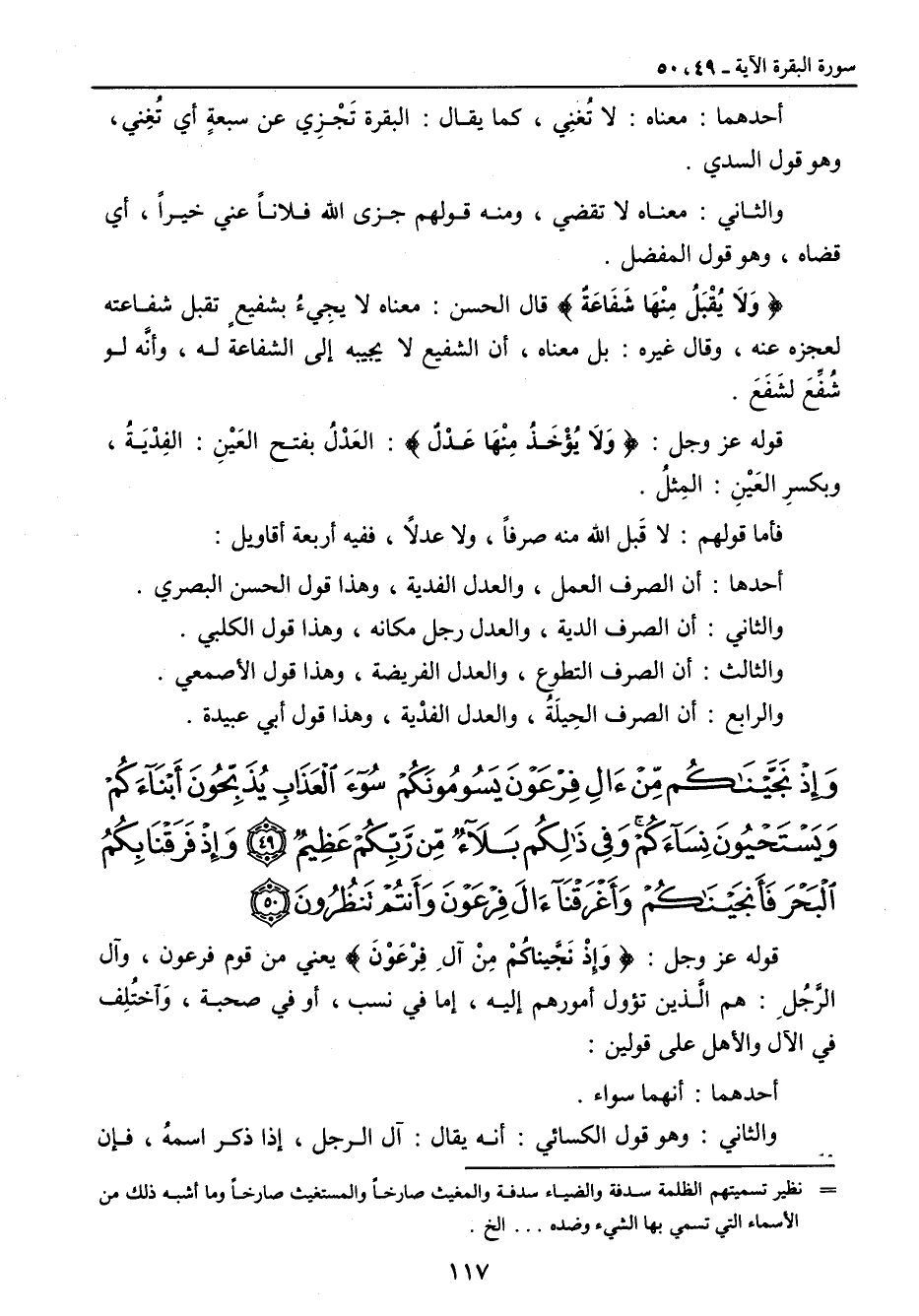 أحدهما: معناه: لا تُغنِي , كما يقال: البقرة تَجْزِي عن سبعةٍ أي تُغِني , وهو قول السدي. والثاني: معناه لا تقضي , ومنه قولهم جزى الله فلاناً عني خيراً , أي قضاه , وهو قول المفضل. {وَلاَ يُقْبَلُ مِنْهَا شَفَاعَةٌ} قال الحسن: معناه لا يجِيءُ بشفيعٍ تقبل شفاعته لعجزه عنه , وقال غيره: بل معناه , أن الشفيع لا يجيبه إلى الشفاعة له , وأنَّه لو شُفِّعَ لشَفَعَ. قوله عز وجل: {وَلاَ يُؤْخَذُ مِنْهَا عَدْلٌ}: العَدْلُ بفتح العَيْنِ: الفِدْيَةُ , وبكسرِ العَيْنِ: المِثلُ. فأما قولهم: لا قَبل الله منه صرفاً , ولا عدلاً , ففيه أربعة أقاويل: أحدها: أن الصرف العمل , والعدل الفدية , وهذا قول الحسن البصري. والثاني: أن الصرف الدية , والعدل رجل مكانه , وهذا قول الكلبي. والثالث: أن الصرف التطوع , والعدل الفريضة , وهذا قول الأصمعي. والرابع: أن الصرف الحِيلَةُ , والعدل الفدْية , وهذا قول أبي عبيدة.