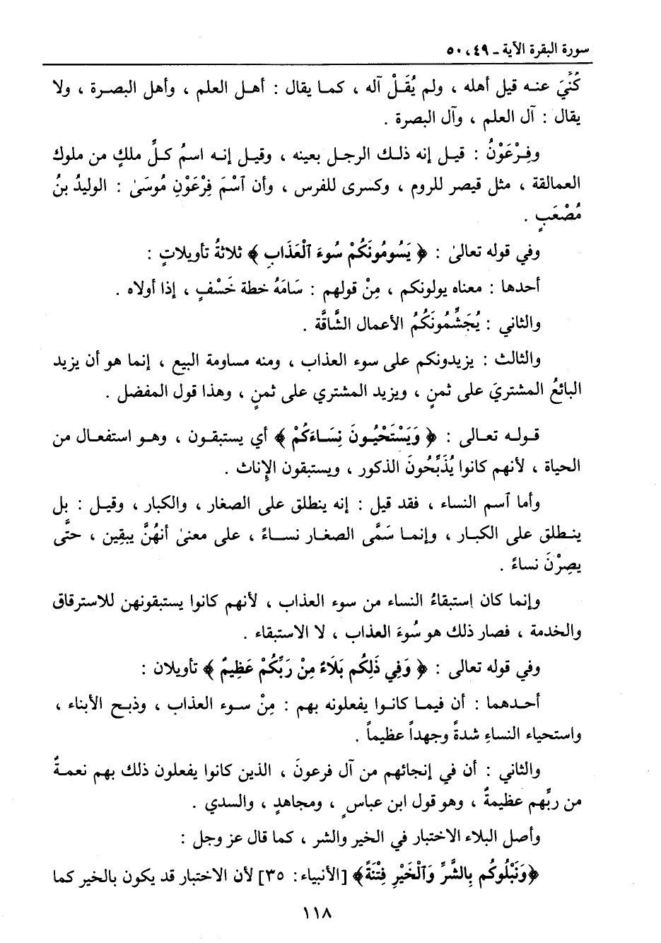 كُنَيَ عنه قيل أهله , ولم يُقَلْ آله , كما يقال: أهل العلم , وأهل البصرة , ولا يقال: آل العلم , وآل البصرة. وفِرْعَوْنُ: قيل إنه ذلك الرجل بعينه , وقيل إنه اسمُ كلِّ ملكٍ من ملوك العمالقة , مثل قيصر للروم , وكسرى للفرس , وأن اسْمَ فِرْعَوْنِ مَوسَى: الوليدُ بنُ مُصْعَبٍ. وفي قوله تعالى: {يَسُومُونَكُمْ سُوءَ الْعَذَابِ} ثلاثةُ تأويلاتٍ: أحدها: معناه يولونكم , مِنْ قولهم: سَامَهُ خطة خَسْفٍ , إذا أولاه. والثاني: يُجَشِّمُونَكُمُ الأعمال الشَّاقَّة. والثالث: يزيدونكم على سوء العذاب , ومنه مساومة البيع , إنما هو أن يزيد البائعُ المشتريَ على ثمنٍ , ويزيد المشتري على ثمنٍ , وهذا قول المفضل. قوله تعالى: {وَيَسْتَحْيُونَ نِسَاءَكُمْ} أي يستبقون , وهو استفعال من الحياة , لأنهم كانوا يُذَبِّحُونَ الذكور , ويستبقون الإناث. وأما اسم النساء , فقد قيل: إنه ينطلق على الصغار , والكبار , وقيل: بل ينطلق على الكبار , وإنما سَمَّي الصغار نساءً , على معنى أنهُنَّ يبقِين , حتَّى يصِرْنَ نساءً. وإنما كان استبقاءُ النساء من سوء العذاب , لأنهم كانوا يستبقونهن للاسترقاق والخدمة , فصار ذلك هو سُوءَ العذاب , لا الاستبقاء. وفي قوله تعالى: {وَفِي ذَلِكُم بَلاَءٌ مِنْ رَبِّكُمْ عَظِيمٌ} تأويلان: أحدهما: أن فيما كانوا يفعلونه بهم: مِنْ سوء العذاب , وذبح الأبناء , واستحياء النساءِ شدةً وجهداً عظيماً. والثاني: أن في إنجائهم من آل فرعونَ , الذين كانوا يفعلون ذلك بهم نعمةٌ من ربِّهم عظيمةٌ , وهو قول ابن عباسٍ , ومجاهدٍ , والسدي. وأصل البلاء الاختبار في الخير والشر , كما قال عز وجل: {وَنَبْلُوكُم بِالشَّرِّ وَالْخَيْرِ فِتْنَةً} [الأنبياء: 35] لأن الاختبار قد يكون بالخير كما