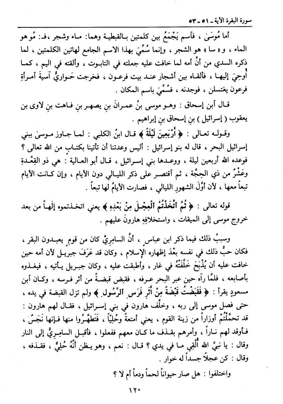أما مُوسَى , فاسم يَجْمَعُ بين كلمتين بالقبطية وهما: ماء وشجر , ف: مُوهو الماء , و (سا) هو الشجر , وإنما سُمِّيَ بهذا الاسم الجامع لهاتين الكلمتين , لما ذكره السدي من أنَّ أمه لما خافت عليه جعلته في التابوت , وألقته في اليم , كما أُوحِيَ إليها , فألقاه بين أشجار عند بيت فرعون , فخرجت حَواريُّ آسيةَ امرأةِ فرعون يغتسلن , فوجدنه , فسُمِّيَ باسم المكان. قال ابن إسحاق: وهو موسى بنُ عمرانَ بنِ يصهر بنِ فاهت بنِ لاوى بن يعقوب (إسرائيل) بنِ إسحاق بنِ إبراهيم. وقوله تعالى: {أَرْبَعِينَ لَيْلَةً} قال ابنُ الكلبي: لما جاوز موسى ببني إسرائيل البحر , قال له بنو إسرائيل: أليس وعدتنا أن تأتينا بكتابٍ من الله تعالى؟ فوعده الله أربعين ليلة , ووعدها بني إسرائيل , قال أبو العالية: هي ذو القِعْدةِ وعَشْرٌ من ذي الحِجَّة , ثم اقتصر على ذكر الليالي دون الأيام , وإن كانت الأيام تبعاً معها , لأن أوَّلَ الشهورِ الليالي , فصارت الأيامُ لها تبعاً. قوله تعالى: {ثُمَّ اتَّخَذْتُمُ الْعِجْلَ مِنْ بَعْدِهِ} يعني اتخذتموه إلهاً من بعد خروج موسى إلى الميقات , واستخلافِهِ هارونَ عليهم. وسببُ ذلك فيما ذكر ابن عباسٍ , أنَّ السامِرِيَّ كان من قومٍ يعبدون البقر , فكان حبُّ ذلك في نفسه بعْدَ إظهاره الإسلام , وكان قد عَرَفَ جبريل لأن أمه حين خافت عليه أن يُذْبَحَ خَلَّفَتْهُ في غار , وأطبقت عليه , وكان جبريل يأتيه , فيغذوه بأصابعه , فلمَّا رآه حين عبر البحر عرفه , فقبض قبضةً من أثر فرسه , وكان ابن مسعودٍ يقرأ: {فَقَبَضْتُ قَبْضَةً مِنْ أَثَرِ فَرَسِ الرَّسُولِ} ولم تزل القبضة في يده , حتى فصل موسى إلى ربه , وخلَّف هارون في بني إسرائيل , فقال لهم هارون: قد تحمَّلْتُمْ أوزاراً من زينة القوم , يعني أمتعةً وحُلِيَاً , فَتَطهَّرُوا منها فإنها نَجَسٌ , فأوقد لهم ناراً , وأمرهم بقذف ما كان معهم ففعلوا , فأقبل السامِرِيُّ إلى النار وقال: يا نبيَّ الله أُلْقِي ما في يدي؟ قال: نعم , وهو يظن أنَّهُ حُلِيٌّ , فقذفه , وقال: كن عجلاً جسداً له خوار. واختلفوا: هل صار حيواناً لحماً ودماً أم لا؟