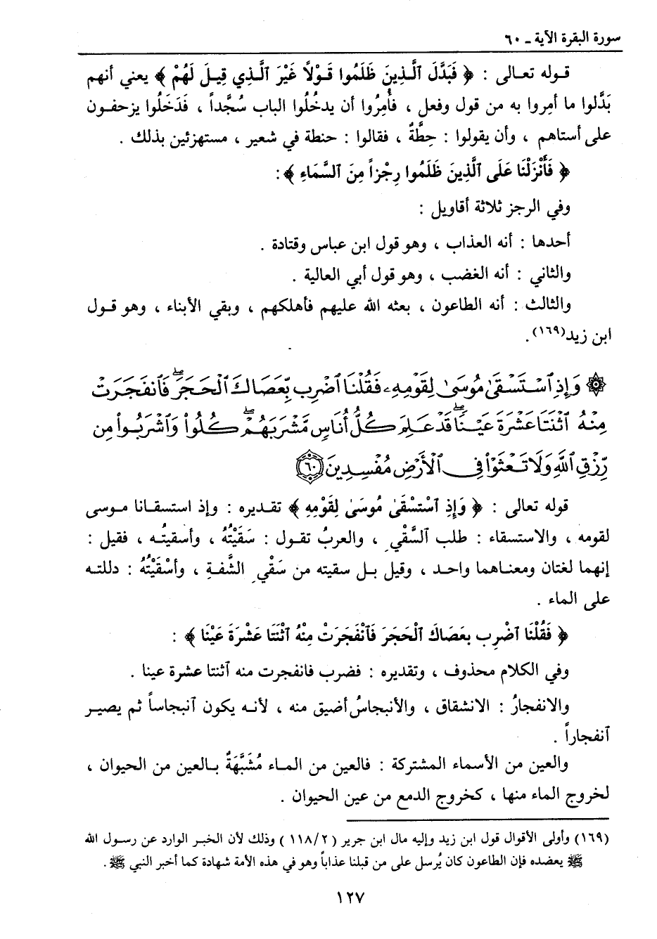 {وإذ استسقى موسى لقومه فقلنا اضرب بعصاك الحجر فانفجرت منه اثنتا عشرة عينا قد علم كل أناس مشربهم كلوا واشربوا من رزق الله ولا تعثوا في الأرض مفسدين} قوله تعالى: {وَإِذِ اسْتسْقَى مُوسَى لِقَوْمِهِ} تقديره: وإذ استسقانا موسى لقومه , والاستسقاء: طلب السَّقْيِ , والعربُ تقول: سَقَيْتُهُ , وأسقيتُه , فقيل: إنهما لغتان ومعناهما واحد , وقيل بل سقيته من سَقْيِ الشَّفةِ , وأسْقَيْتُهُ: دللته على الماء. {فَقُلْنَا اضْرِب بعَصَاكَ الْحَجَرَ فَانْفَجَرَتْ مِنْهُ اثْنَتَا عَشْرَةَ عَيْنَا}: وفي الكلام محذوف , وتقديره: فضرب فانفجرت منه اثنتا عشرة عينا. والانفجارُ: الانشقاق , والأنبجاسُ أضيق منه , لأنه يكون انبجاساً ثم يصير انفجاراً. والعين من الأسماء المشتركة: فالعين من الماء مُشَبَّهَةٌ بالعين من الحيوان , لخروج الماء منها , كخروج الدمع من عين الحيوان.