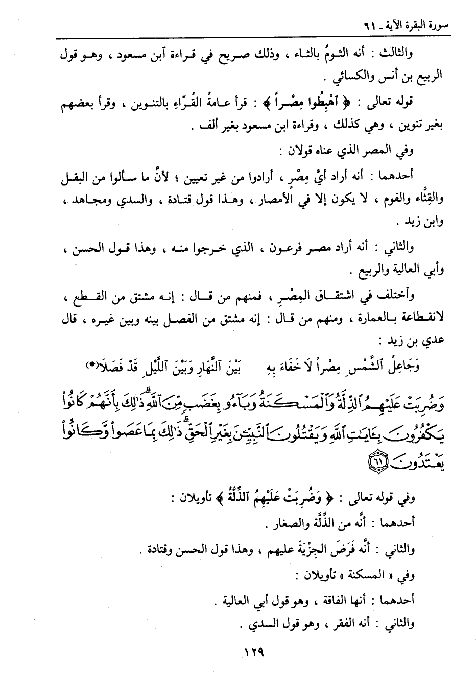 والثالث: أنه الثومُ بالثاء , وذلك صريح في قراءة ابن مسعود , وهو قول الربيع بن أنس والكسائي. قوله تعالى: {اهْبِطُوا مِصْراً}: قرأ عامةُ القُرّاءِ بالتنوين , وقرأ بعضهم بغير تنوين , وهي كذلك , وقراءة ابن مسعود بغير ألف. وفي المصر الذي عناه قولان: أحدهما: أنه أراد أيَّ مِصْرٍ , أرادوا من غير تعيين؛ لأنَّ ما سألوا من البقل والقثَّاء والفوم , لا يكون إلا في الأمصار , وهذا قول قتادة , والسدي ومجاهد , وابن زيد. والثاني: أنه أراد مصر فرعون , الذي خرجوا منه , وهذا قول الحسن , وأبي العالية والربيع. واختلف في اشتقاق المِصْرِ , فمنهم من قال: إنه مشتق من القطع , لانقطاعه بالعمارة , ومنهم من قال: إنه مشتق من الفصل بينه وبين غيره , قال عدي بن زيد: