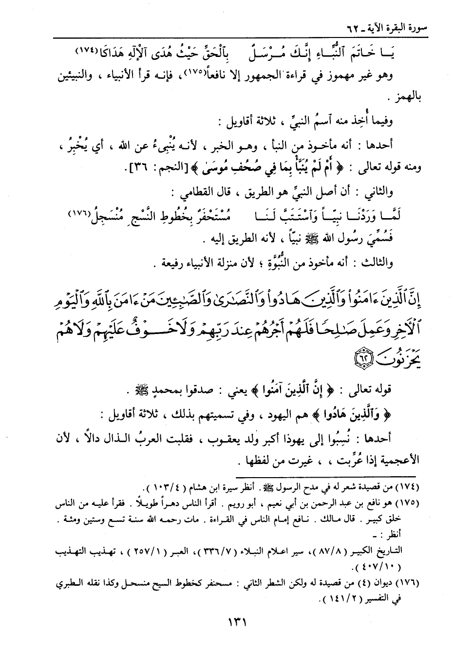 {إن الذين آمنوا والذين هادوا والنصارى والصابئين من آمن بالله واليوم الآخر وعمل صالحا فلهم أجرهم عند ربهم ولا خوف عليهم ولا هم يحزنون} قوله تعالى: {إِنَّ الَّذِينَ آمَنُوا} يعني: صدقوا بمحمدٍ صلى الله عليه وسلم. {وَالَّذِينَ هَادُوا} هم اليهود , وفي تسميتهم بذلك , ثلاثة أقاويل: أحدها: نُسِبُوا إلى يهوذا أكبر ولد يعقوب , فقلبت العربُ الذال دالاً , لأن الأعجمية إذا عُرِّبت , غيرت من لفظها.