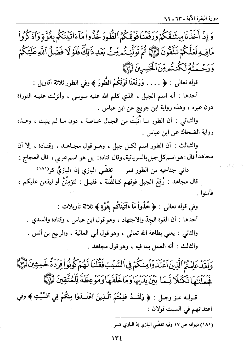 {وإذ أخذنا ميثاقكم ورفعنا فوقكم الطور خذوا ما آتيناكم بقوة واذكروا ما فيه لعلكم تتقون ثم توليتم من بعد ذلك فلولا فضل الله عليكم ورحمته لكنتم من الخاسرين} قوله تعالى: { ... . وَرَفَعْنَا فَوْقَكُمُ الطُّورَ} وفي الطور ثلاثة أقاويل: أحدها: أنه اسم الجبل , الذي كلم الله عليه موسى , وأنزلت عليه التوراة دون غيره , وهذه رواية ابن جريج عن ابن عباس. والثاني: أن الطور ما أَنْبَتَ من الجبال خاصة , دون ما لم ينبت , وهذه رواية الضحاك عن ابن عباس. والثالث: أن الطور اسم لكل جبل , وهو قول مجاهد , وقتادة , إلا أن مجاهداً قال: هو اسم كل جبل بالسريانية , وقال قتادة: بل هو اسم عربي , قال العجاج: