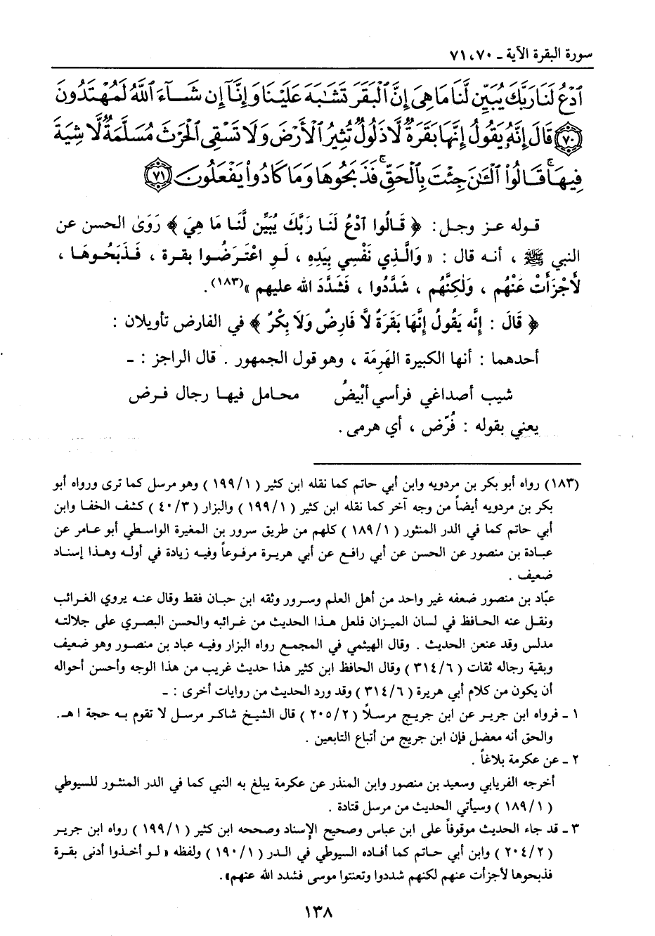 ادع لنا ربك يبين لنا ما هي إن البقر تشابه علينا وإنا إن شاء الله لمهتدون قال إنه يقول إنها بقرة لا ذلول تثير الأرض ولا تسقي الحرث مسلمة لا شية فيها قالوا الآن جئت بالحق فذبحوها وما كادوا يفعلون} قوله عز وجل: {قَالُوا ادْعُ لَنَا رَبَّكَ يُبَيِّن لَّنَا مَا هِيَ} رَوَى الحسن عن النبي صلى الله عليه وسلم , أنه قال: (والَّذِي نَفْسِي بِيَدِهِ , لَوِ اعْتَرَضُوا بقرة , فَذَبَحُوها , لأَجْزَأَتْ عَنْهُم , وَلكِنَّهُم , شَدًّدوا , فَشَدَّد الله عليهم). {قَالَ: إِنَّه يَقُولُ إِنَّهَا بَقَرَةٌ لاَّ فَارِضٌ وَلاَ بِكْرٌ} في الفارض تأويلان: أحدهما: أنها الكبيرة الهَرِمَة , وهو قول الجمهور. قال الراجز: