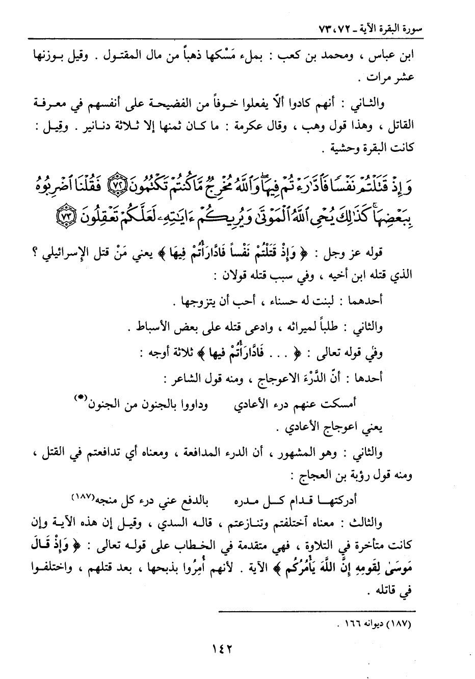 {وإذ قتلتم نفسا فادارأتم فيها والله مخرج ما كنتم تكتمون فقلنا اضربوه ببعضها كذلك يحيي الله الموتى ويريكم آياته لعلكم تعقلون} قوله عز وجل: {وَإِذْ قَتَلْتُمْ نَفْساً فَادَّارَأْتُمْ فِيهَا} يعني من قتل الإسرائيلي؟ الذي قتله ابن أخيه , وفي سبب قتله قولان: أحدهما: لبنت له حسناء , أحب أن يتزوجها. والثاني: طلباً لميراثه , وادعى قتله على بعض الأسباط. وفي قوله تعالى: { ... فَادَّارَأْتُم فيها} ثلاثة أوجه: أحدها: أنّ الَّدْرءَ الاعوجاج , ومنه قول الشاعر: