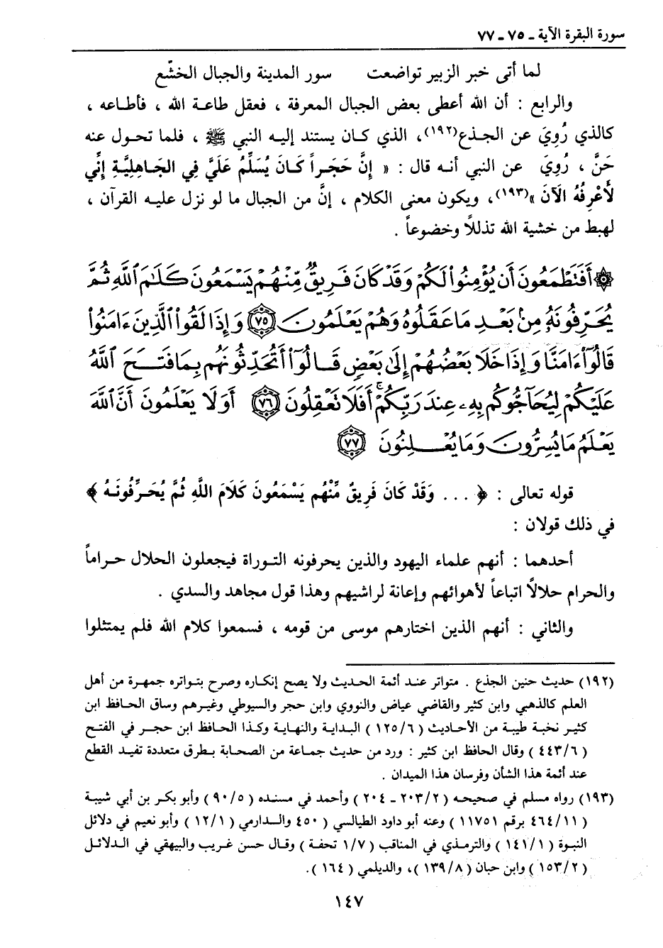 {أفتطمعون أن يؤمنوا لكم وقد كان فريق منهم يسمعون كلام الله ثم يحرفونه من بعد ما عقلوه وهم يعلمون وإذا لقوا الذين آمنوا قالوا آمنا وإذا خلا بعضهم إلى بعض قالوا أتحدثونهم بما فتح الله عليكم ليحاجوكم به عند ربكم أفلا تعقلون أو لا يعلمون أن الله يعلم ما يسرون وما يعلنون} قوله تعالى: { ... وَقَدْ كَانَ فَرِيقٌ مِّنْهُم يَسْمَعُون كَلاَمَ اللهِ ثُمَّ يُحَرِّفُونَهُ} في ذلك قولان: أحدهما: أنهم علماء اليهود والذين يحرفونه التوراة فيجعلون الحلال حراماً والحرام حلالاً ابتاعاً لأهوائهم وإعانة لراشيهم وهذا قول مجاهد والسدي. والثاني: أنهم الذين اختارهم موسى من قومه , فسمعوا كلام الله فلم يمتثلوا