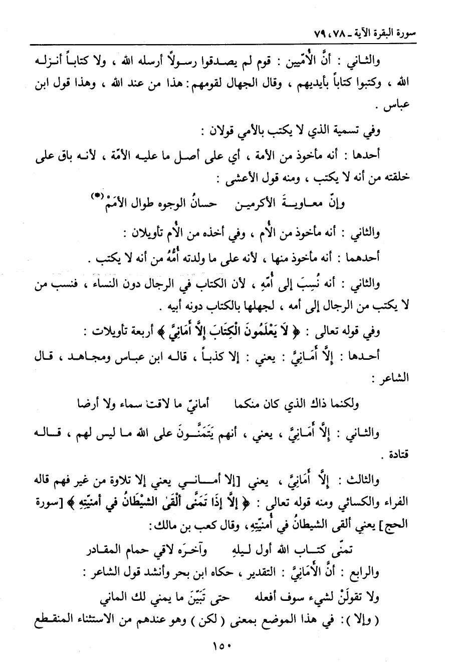 والثاني: أنه مأخوذ من الأُم , وفي أخذه من الأُم تأويلان: أحدهما: أنه مأخوذ منها , لأنه على ما ولدته أُمُّهُ من أنه لا يكتب. والثاني: أنه نُسِبَ إلى أُمّهِ , لأن الكتاب في الرجال دون النساء , فنسب من لا يكتب من الرجال إلى أمه , لجهلها بالكتاب دونه أبيه. وفي قوله تعالى: {لاَ يَعْلَمُونَ الْكِتَابَ إِلاَّ أَمَانِيَّ} أربعة تأويلات: أحدها: إِلاَّ أَمَانِيَّ: يعني: إلا كذباً , قاله ابن عباس ومجاهد , قال الشاعر: