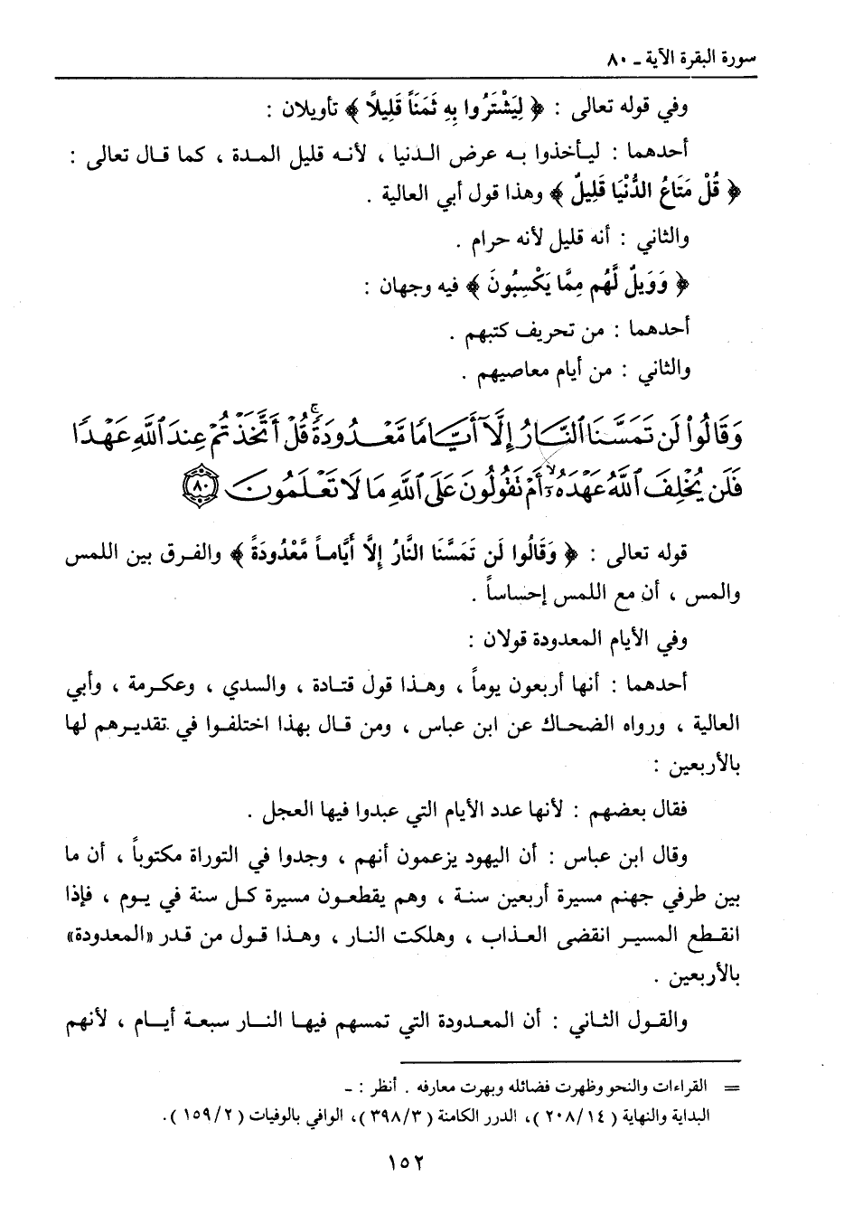 {وقالوا لن تمسنا النار إلا أياما معدودة قل أتخذتم عند الله عهدا فلن يخلف الله عهده أم تقولون على الله ما لا تعلمون} قوله تعالى: {وَقَالُوا لَن تَمَسَّنَا النَّارُ إِلاَّ أَيَّاماً مَّعْدُودَةً} والفرق بين اللمس والمس , أن مع اللمس إحساساً. وفي الأيام المعدودة قولان: أحدهما: أنها أربعون يوماً , وهذا قول قتادة , والسدي , وعكرمة , وأبي العالية , ورواه الضحاك عن ابن عباس , ومن قال بهذا اختلفوا في تقديرهم لها بالأربعين: فقال بعضهم: لأنها عدد الأيام التي عبدوا فيها العجل. وقال ابن عباس: أن اليهود يزعمون أنهم , وجدوا في التوراة مكتوباً , أن ما بين طرفي جهنم مسيرة أربعين سنة , وهم يقطعون مسيرة كل سنة في يوم , فإذا انقطع المسير انقضى العذاب , وهلكت النار , وهذا قول من قدر (المعدودة) بالأربعين. والقول الثاني: أن المعدودة التي تمسهم فيها النار سبعة أيام , لأنهم