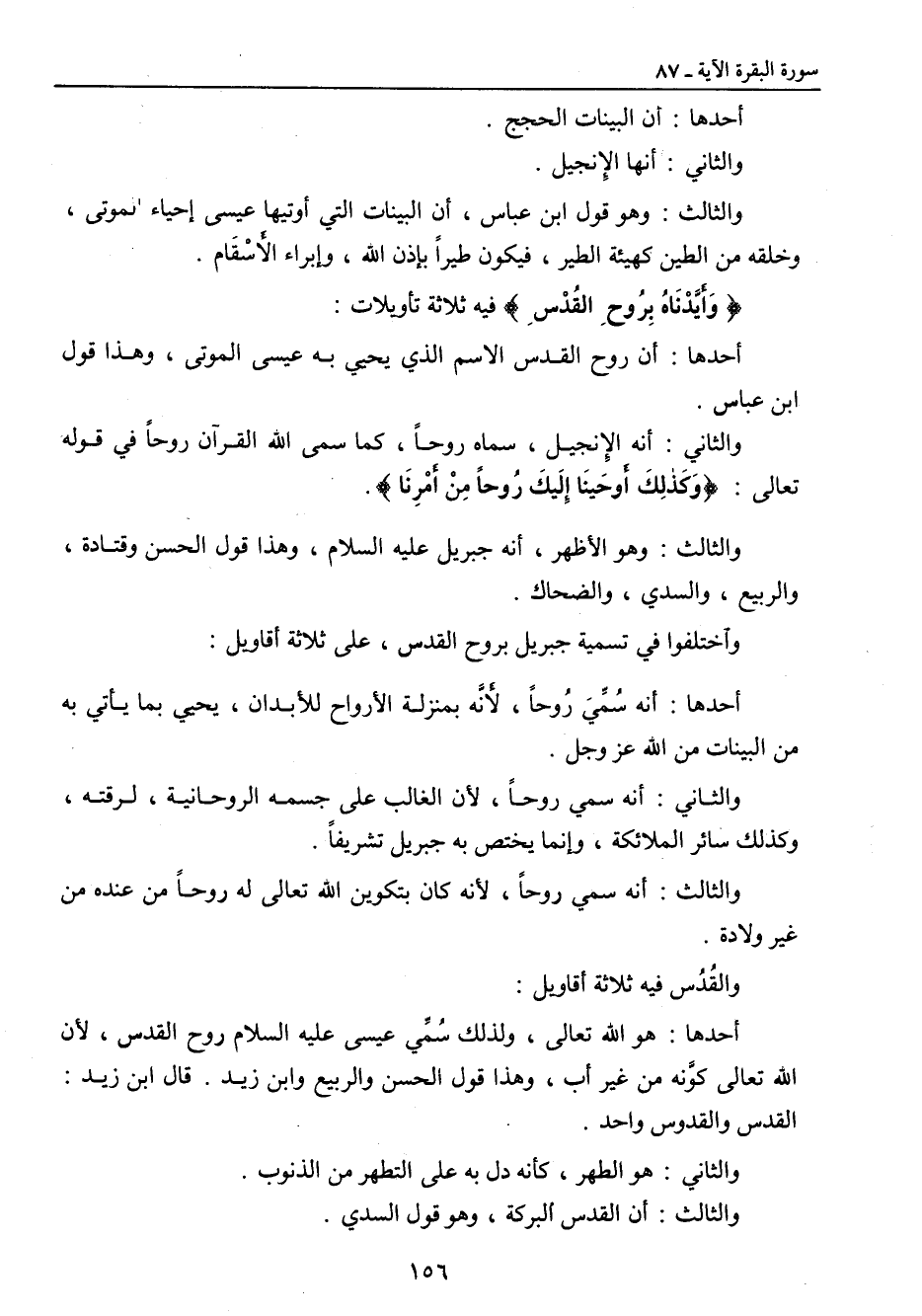أحدها: أن البينات الحجج. والثاني: أنها الإنجيل. والثالث: وهو قول ابن عباس , أن البينات التي أوتيها عيسى إحياء الموتى , وخلقه من الطين كهيئة الطير , فيكون طيراً بإذن الله , وإبراء الأسْقَام. {وَأَيَّدْنَاهُ بِرُوحِ القُدْسِ} فيه ثلاثة تأويلات: أحدها: أن روح القدس الاسم الذي يحيي به عيسى الموتى , وهذا قول ابن عباس. والثاني: أنه الإنجيل , سماه روحاً , كما سمى الله القرآن روحاً في قوله تعالى: {وَكَذلِكَ أَوحَينَا إِلَيكَ رُوحاً مِنْ أَمْرِنَا}. والثالث: وهو الأظهر , أنه جبريل عليه السلام , وهذا قول الحسن وقتادة , والربيع , والسدي , والضحاك. واختلفوا في تسمية جبريل بروح القدس , على ثلاثة أقاويل: أحدها: أنه سُمِّيَ رُوحاً , لأَنَّه بمنزلة الأرواح للأبدان , يحيي بما يأتي به من البينات من الله عز وجل. والثاني: أنه سمي روحاً , لأن الغالب على جسمه الروحانية , لرقته , وكذلك سائر الملائكة , وإنما يختص به جبريل تشريفاً. والثالث: أنه سمي روحاً , لأنه كان بتكوين الله تعالى له روحاً من عنده من غير ولادة. والقُدُس فيه ثلاثة أقاويل: أحدها: هو الله تعالى , ولذلك سُمِّي عيسى عليه السلام روح القدس , لأن الله تعالى كوَّنه من غير أب , وهذا قول الحسن والربيع وابن زيد. قال ابن زيد: القدس والقدوس واحد. والثاني: هو الظهر , كأنه دل به على التطهر من الذنوب. والثالث: أن القدس البركة , وهو قول السدي.