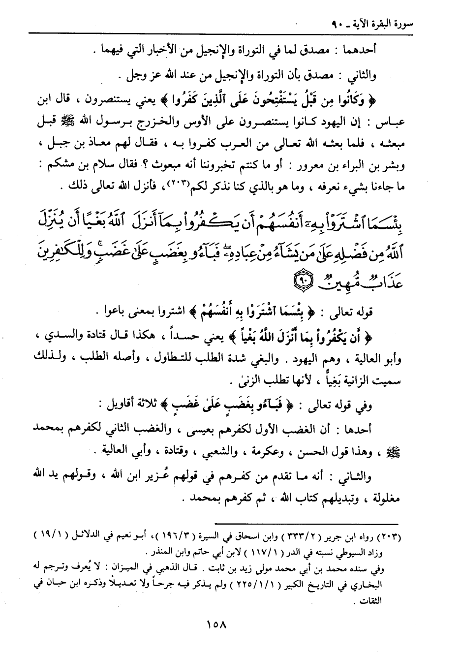 {بئسما اشتروا به أنفسهم أن يكفروا بما أنزل الله بغيا أن ينزل الله من فضله على من يشاء من عباده فباؤوا بغضب على غضب وللكافرين عذاب مهين} قوله تعالى: {بِئْسَمَا اشْتَرَوْا بِهِ أَنفُسَهُمْ} اشتروا بمعنى باعوا. {أن يَكْفُرُوا بِمَا أَنْزَلَ اللهُ بَغْياً} يعني حسداً , هكذا قال قتادة والسدي , وأبو العالية , وهم اليهود. والبغي شدة الطلب للتطاول , وأصله الطلب , ولذلك سميت الزانية بَغِياً , لأنها تطلب الزنى. وفي قوله تعالى: {فَبَآءُو بِغَضَبٍ عَلَى غَضَبٍ} ثلاثة أقاويل: أحدها: أن الغضب الأول لكفرهم بعيسى , والغضب الثاني لكفرهم بمحمد صلى الله عليه وسلم , وهذا قول الحسن , وعكرمة , والشعبي , وقتادة , وأبي العالية. والثاني: أنه ما تقدم من كفرهم في قولهم عُزير ابن الله , وقولهم يد الله مغلولة , وتبديلهم كتاب الله , ثم كفرهم بمحمد.